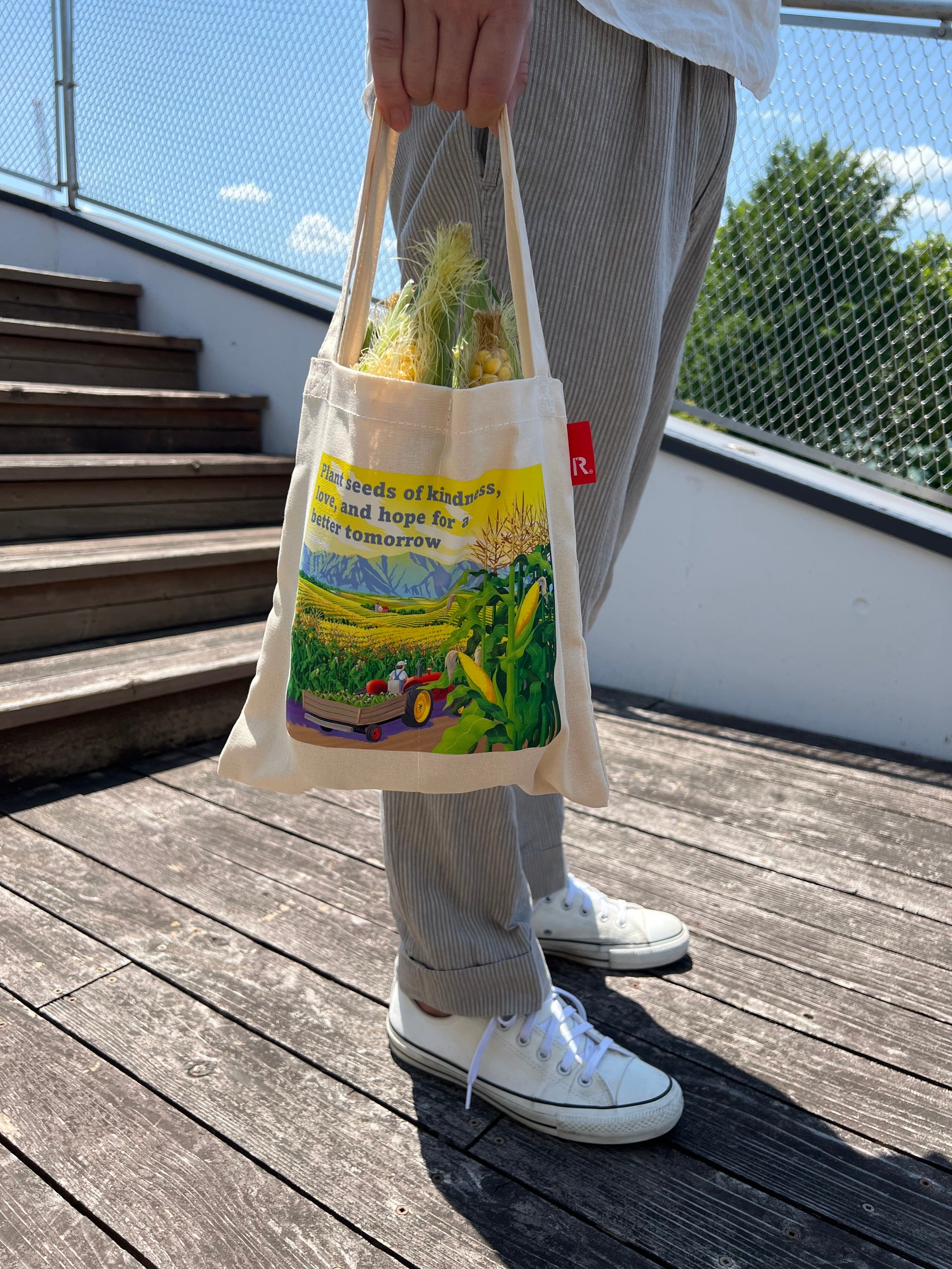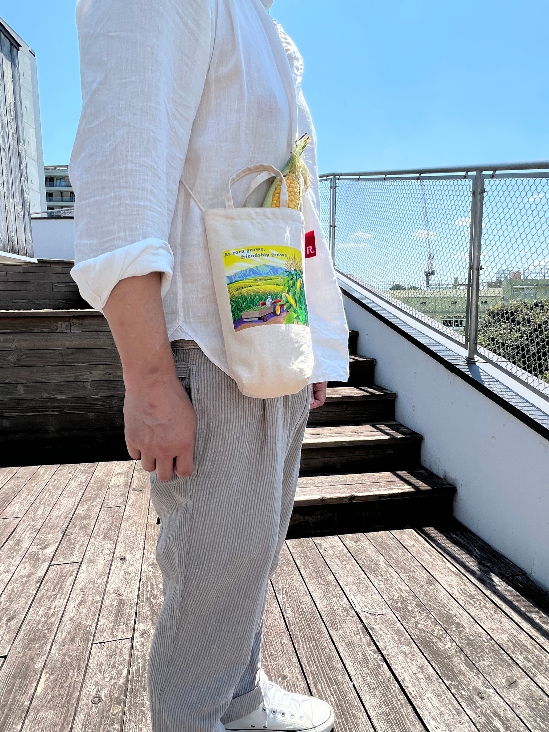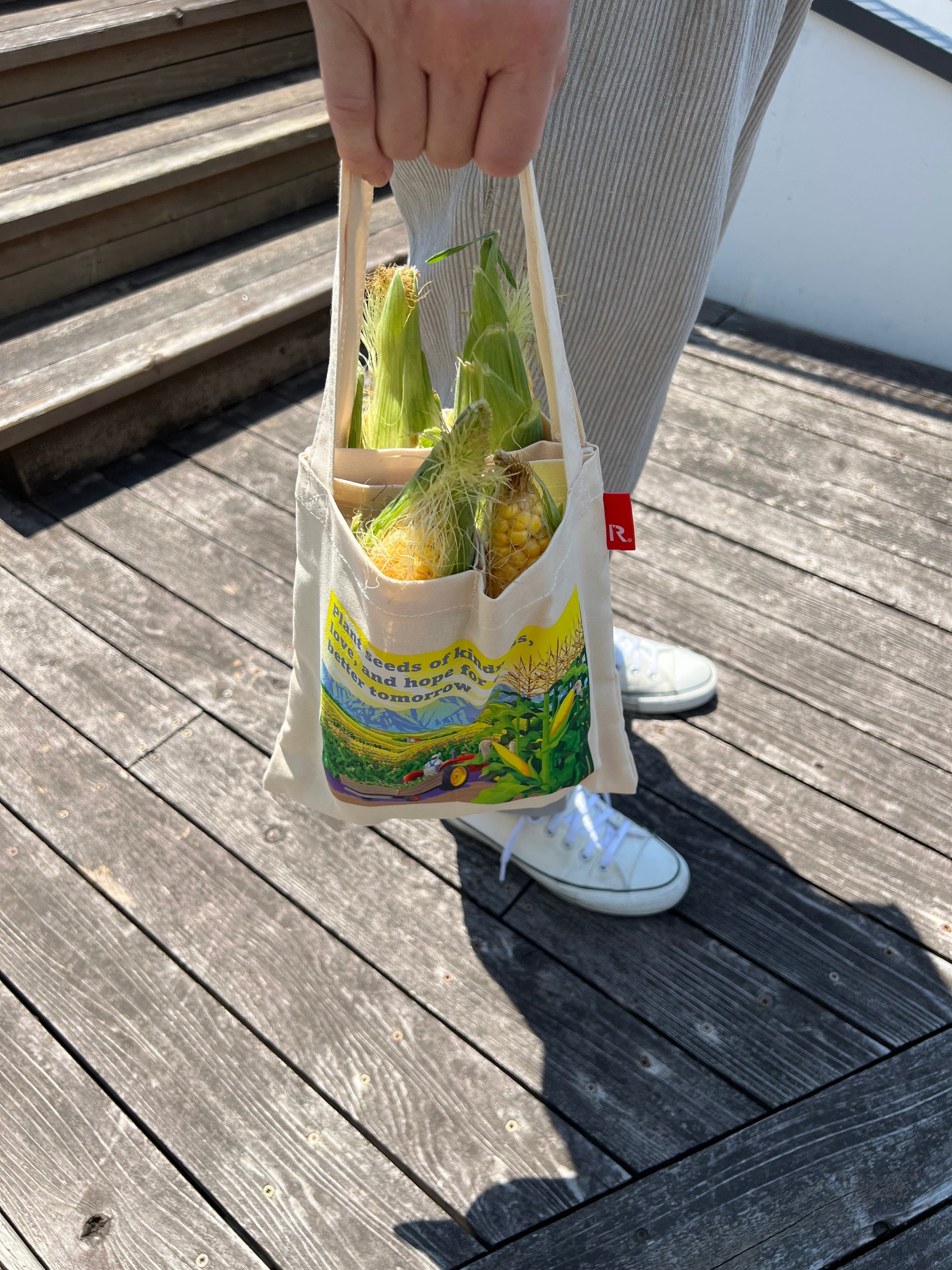 芽室町のスイートコーンのおいしさに驚愕。そして、コーン畑に野球場を作るという町の方々の夢に共感し、すぐさまコラボレーションを決意したROOTOTE。芽室町のみなさんとともに試作を重ね、ついに完成した「コーン専用トート」!果汁あふれる極上のスイートコーンを届ける高野農場の高野竜二さんをモデルに、北海道在住のイラストレーター前橋康博さんが手がけた作品を、コーンや農業にちなんだメッセージとともにプリントしたコットントートです。
