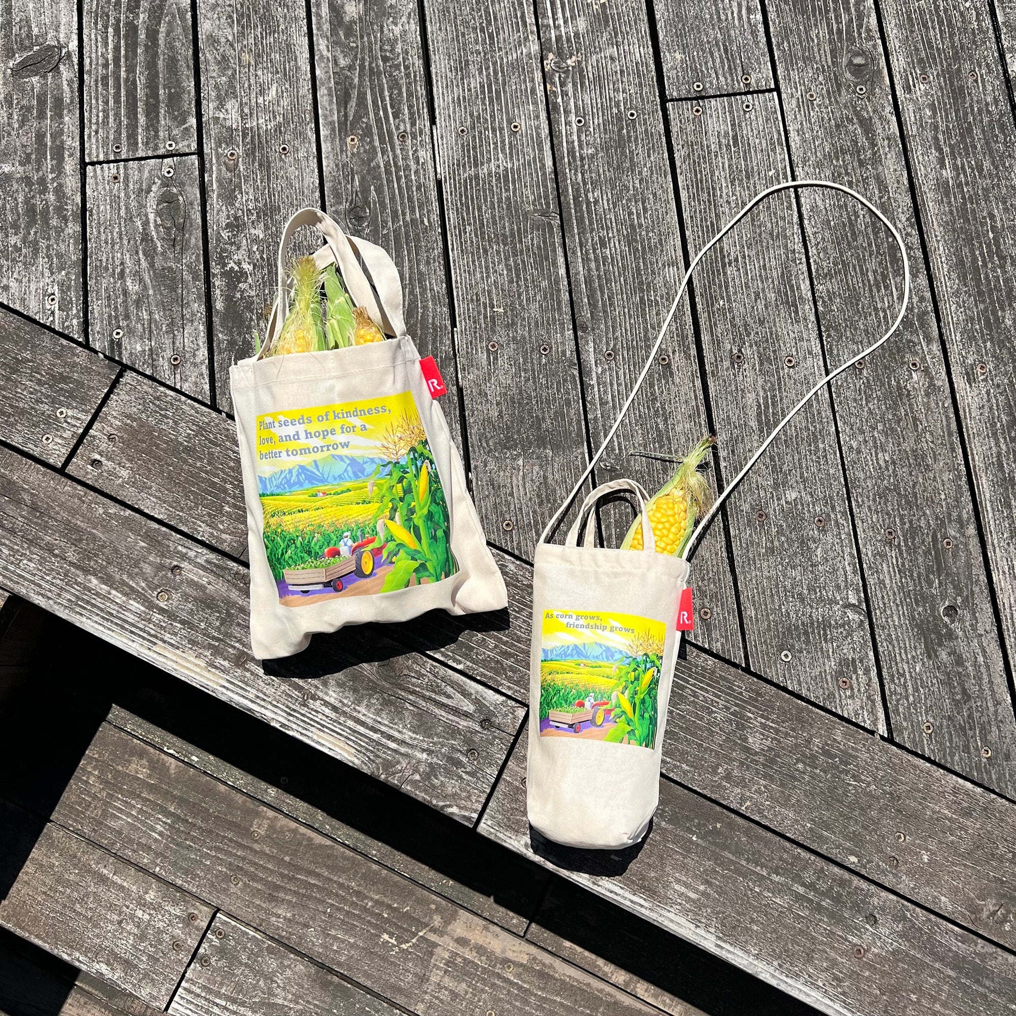 収納したコーンの葉やひげが、ほどよく顔をのぞかせてくれるサイズ感がたまらない1本タイプ。斜めがけできて、いつでもどこでもスイートコーンを携帯できます。”As corn grows, friendship grows.”(コーンが成長するにつれて友情も成長する。)友情や関係性は、時間と共に成長し深まるということわざをプリントしています。