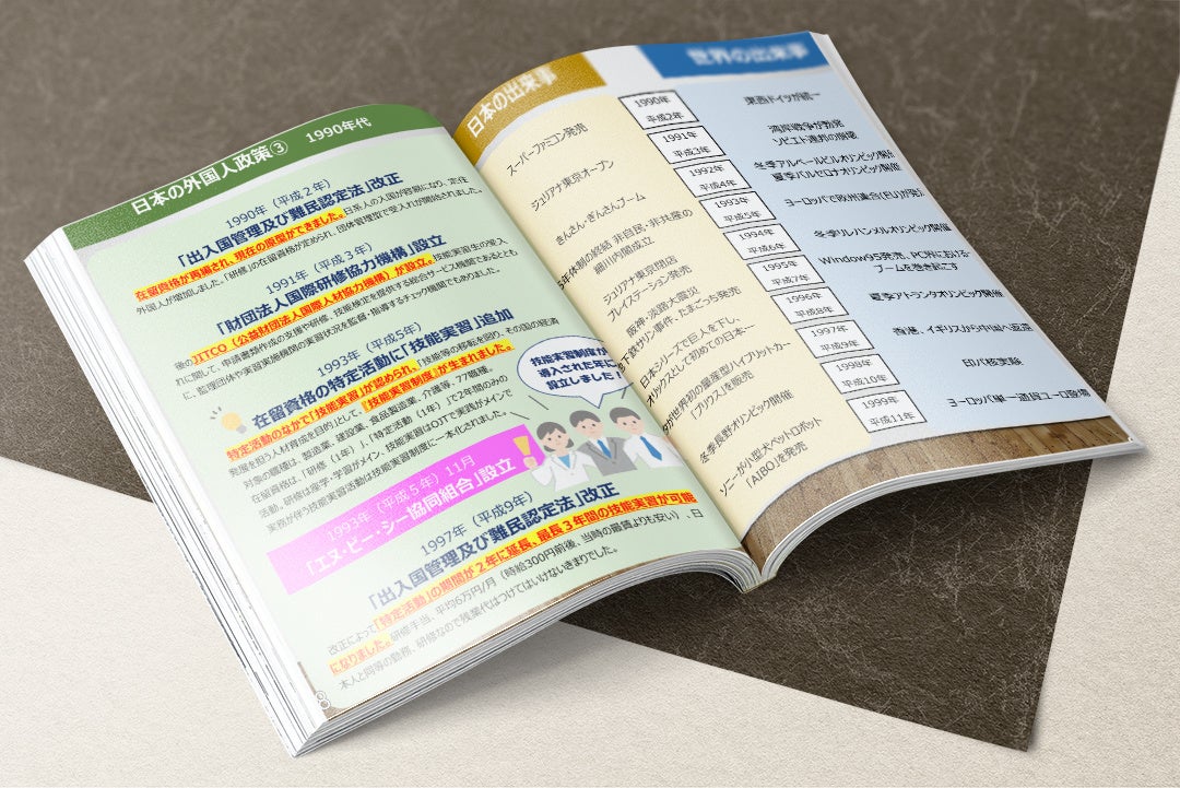 エヌ・ビー・シー協同組合は、研修制度と呼ばれていた時から本制度に関わっており、制度の変化とともに歩んで参りました。その経験をもとに本書では、技能実習制度及び日本における外国人政策の変遷をまとめています。同時に日本と世界の主な出来事も併記しましたので、その政策の背景にも思いを馳せられるような構成となっております。