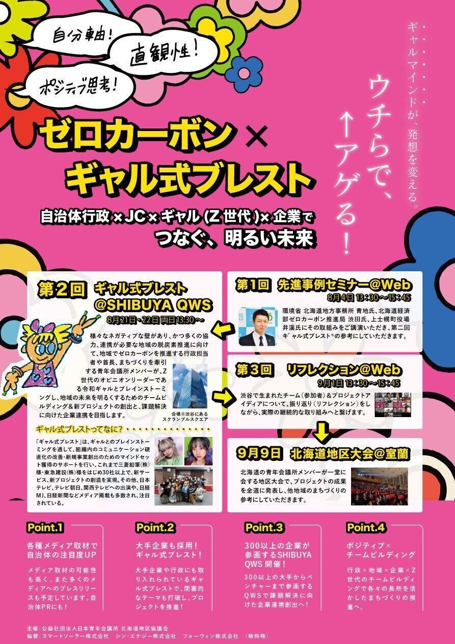 ギャル式ゼロカーボンとは、CGOドットコムの主力事業「ギャル式ブレスト®︎」の手法を用いて、「脱炭素」をテーマに、未来の持続可能な地域づくりに向けた施策のタネを生むことを目指すプロジェクトです。北海道青年会議所様とともに、約1ヶ月間、全4回のプログラムにわたり実施しています。