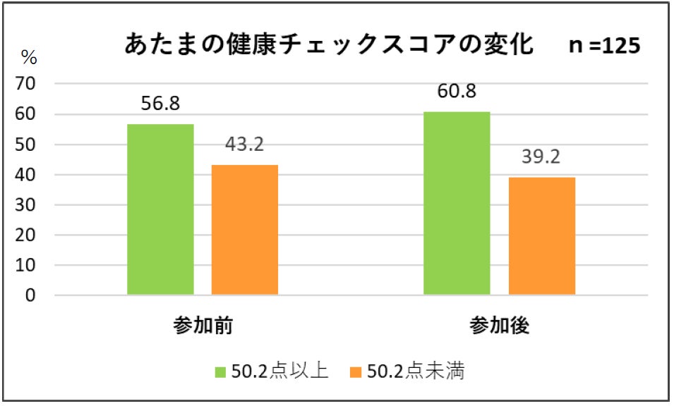 本事業では、あたまの健康チェック®の独自指標MPI値(範囲:0-100)の50.2をカットオフラインとして定め、正常群と機能低下群として観察されました。3カ月間の運動教室前後にあたまの健康チェック®を用いて評価された認知機能の定量データでは、参加者の4%で機能低下群から正常群への移行が確認されました。