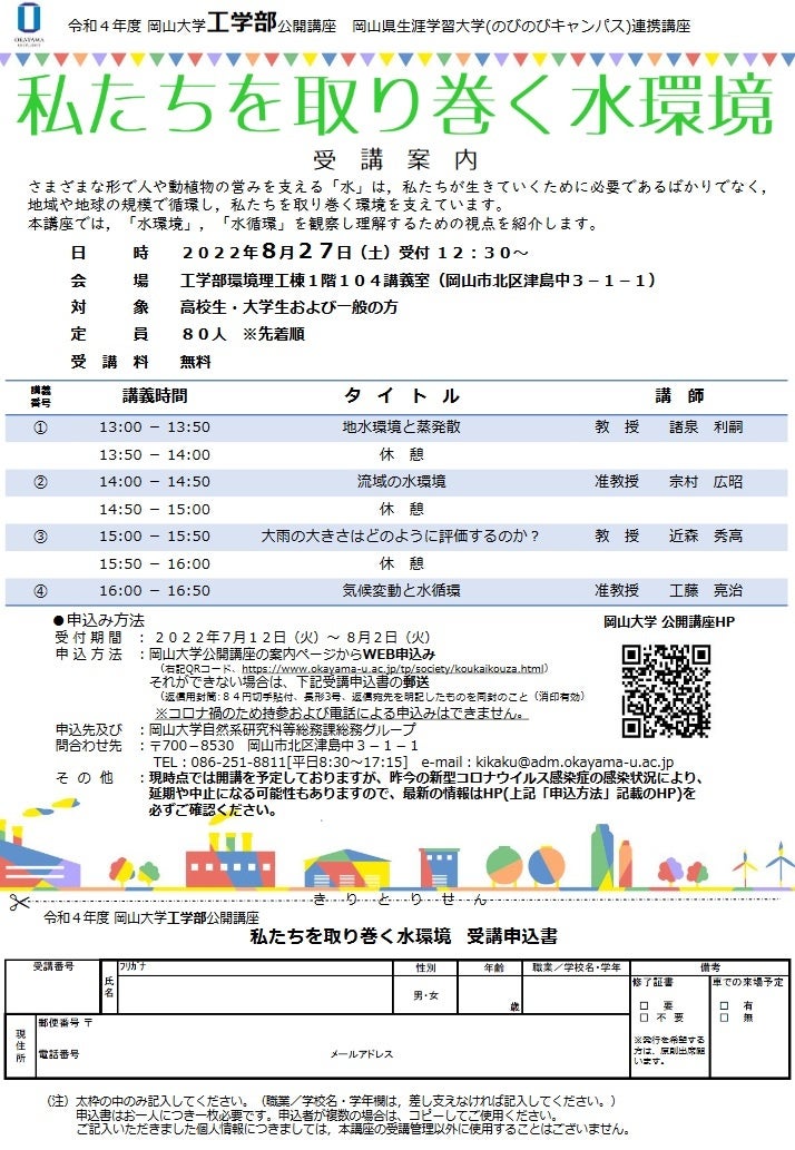 国立大学法人岡山大学(本部:岡山市北区、学長:槇野博史)の工学部では2022年度の公開講座を2022年8月27日(土)に、高校生・大学生および一般の方を対象に開催します。