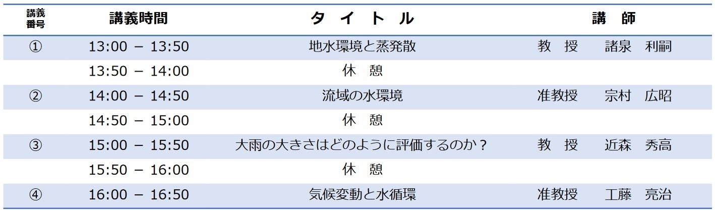 本公開講座「私たちを取り巻く水環境」では、「水環境」、「水循環」を観察し理解するための視点を紹介します。みなさまのご参加を心からお待ちしております。