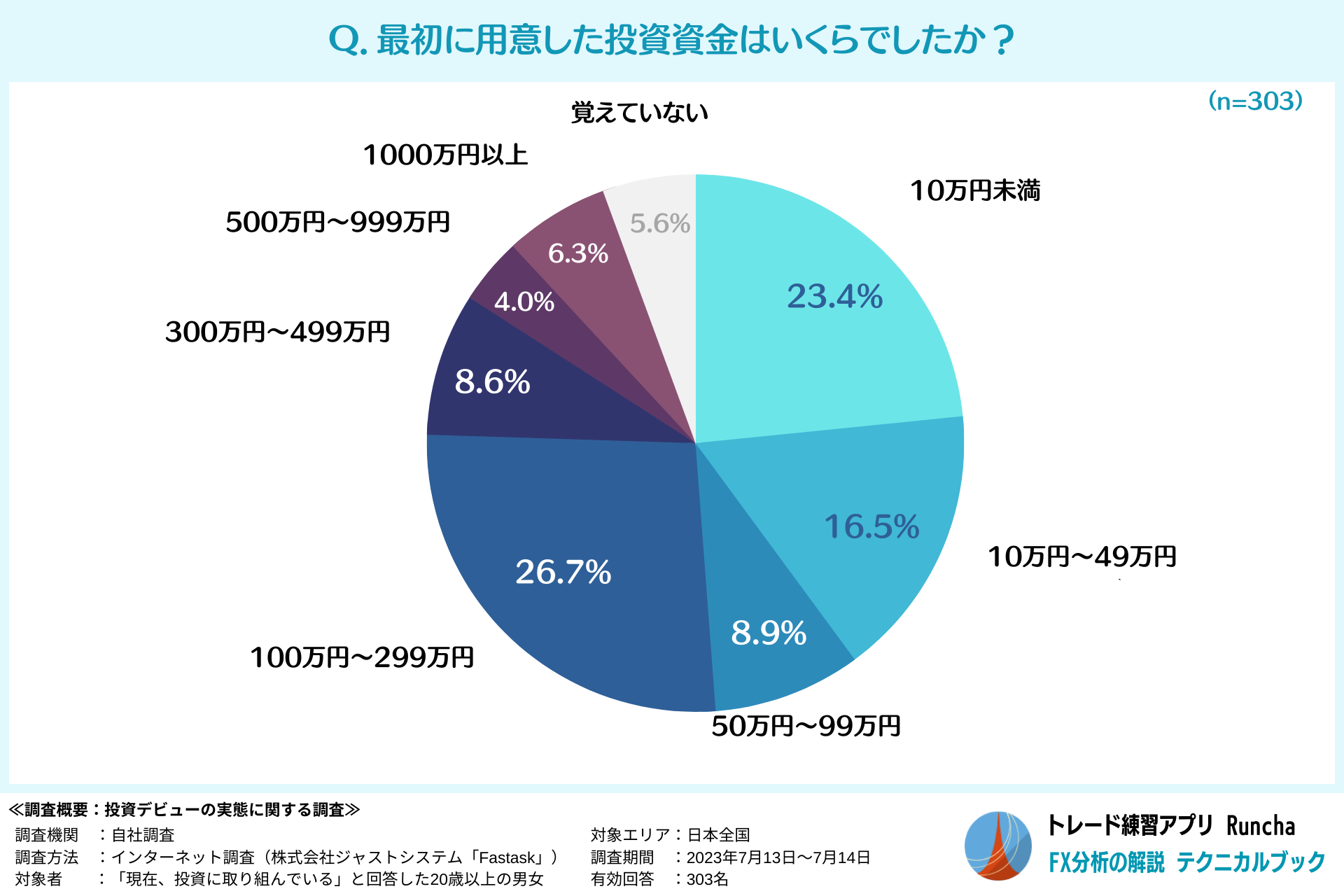 2.投資デビュー時の資金は50万円未満の人が39.9%、10万円未満の人も23.4%に上る
