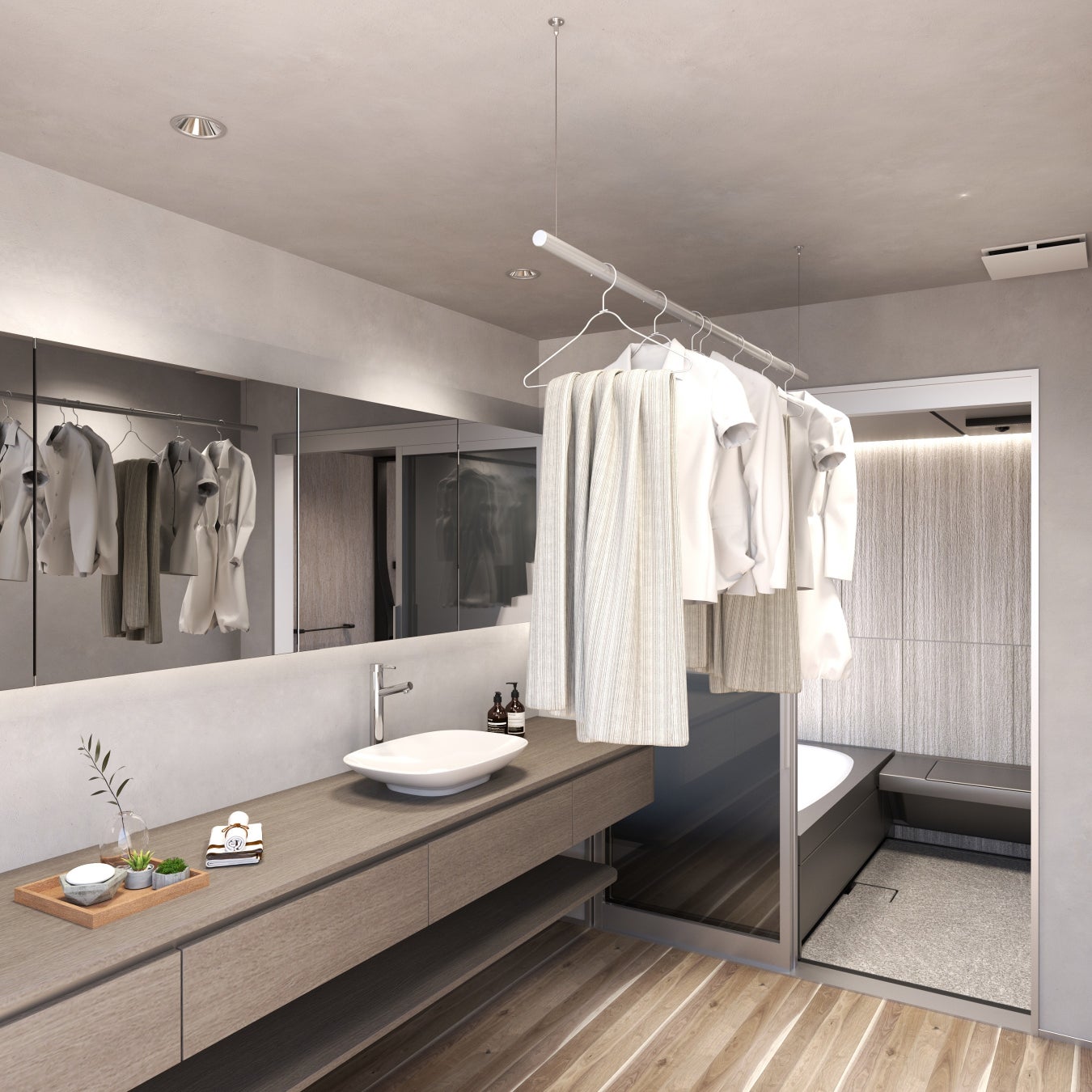 共働き世帯の増加や、部屋干しの普及により、ランドリースペースのニーズが増加しています。ランドリースペースに欠かせない室内物干しバー。以前は、あまり見せたくない、隠したいアイテムでしたが、最近では空間をデザインするインテリアの一部になりつつあります。
