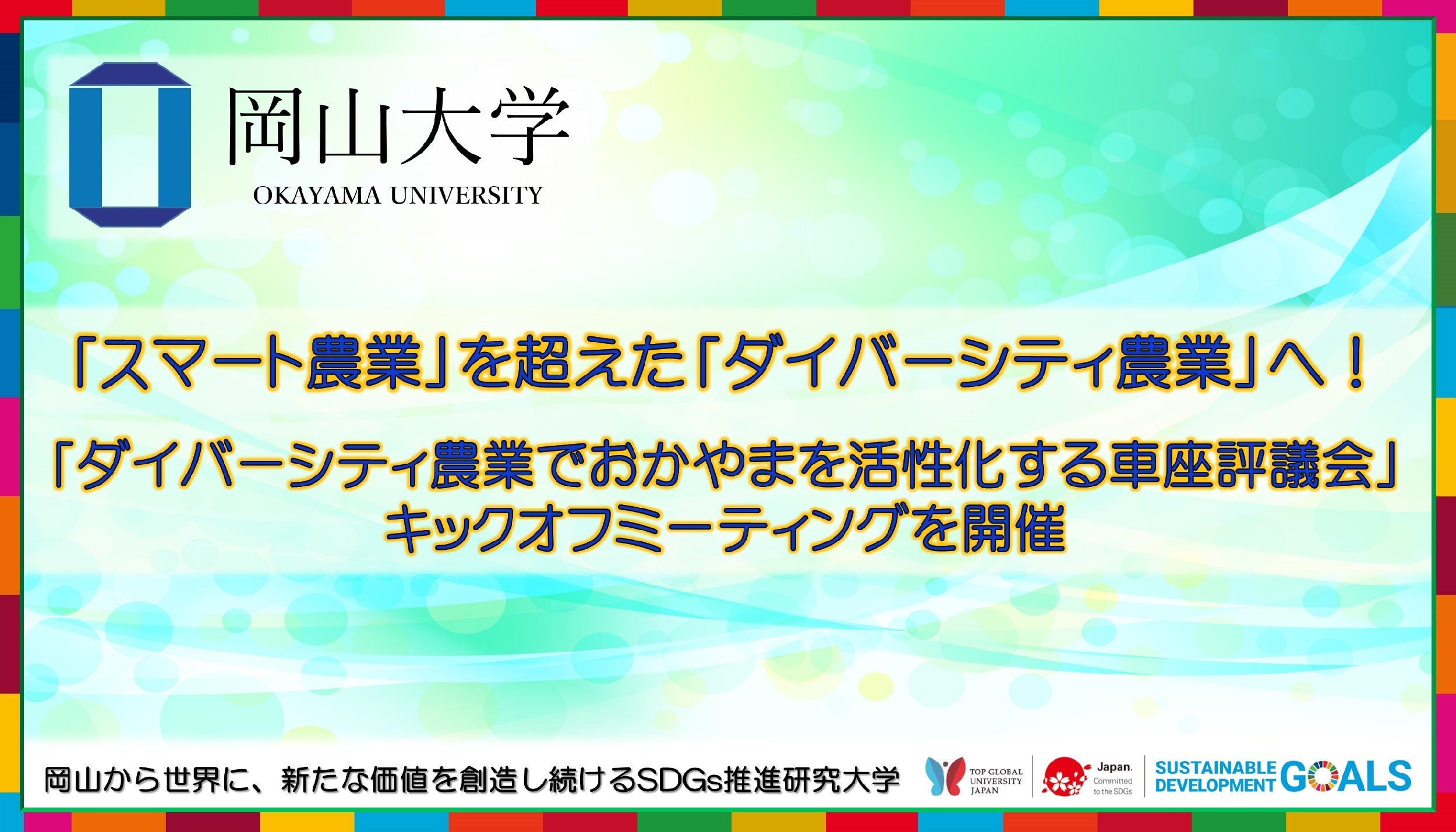 国立大学法人岡山大学(本部:岡山市北区、学長:槇野博史)は、2022年6月21日、「ダイバーシティ農業でおかやまを活性化する車座評議会」を設立し、そのキックオフミーティングを津島キャンパス(岡山市北区)で開催しました。