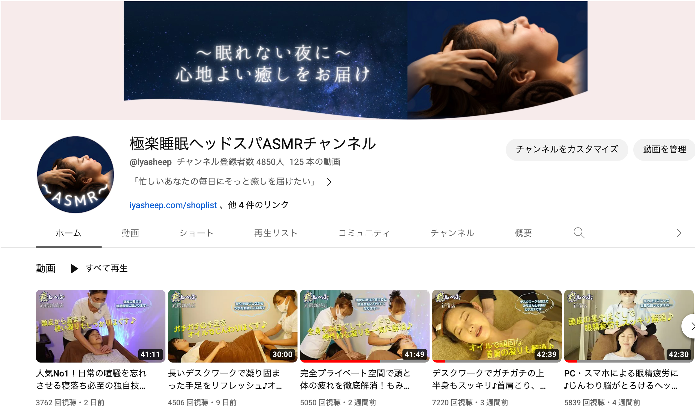 「極楽睡眠ヘッドスパASMRチャンネル」では映像と音で癒しをお届け
