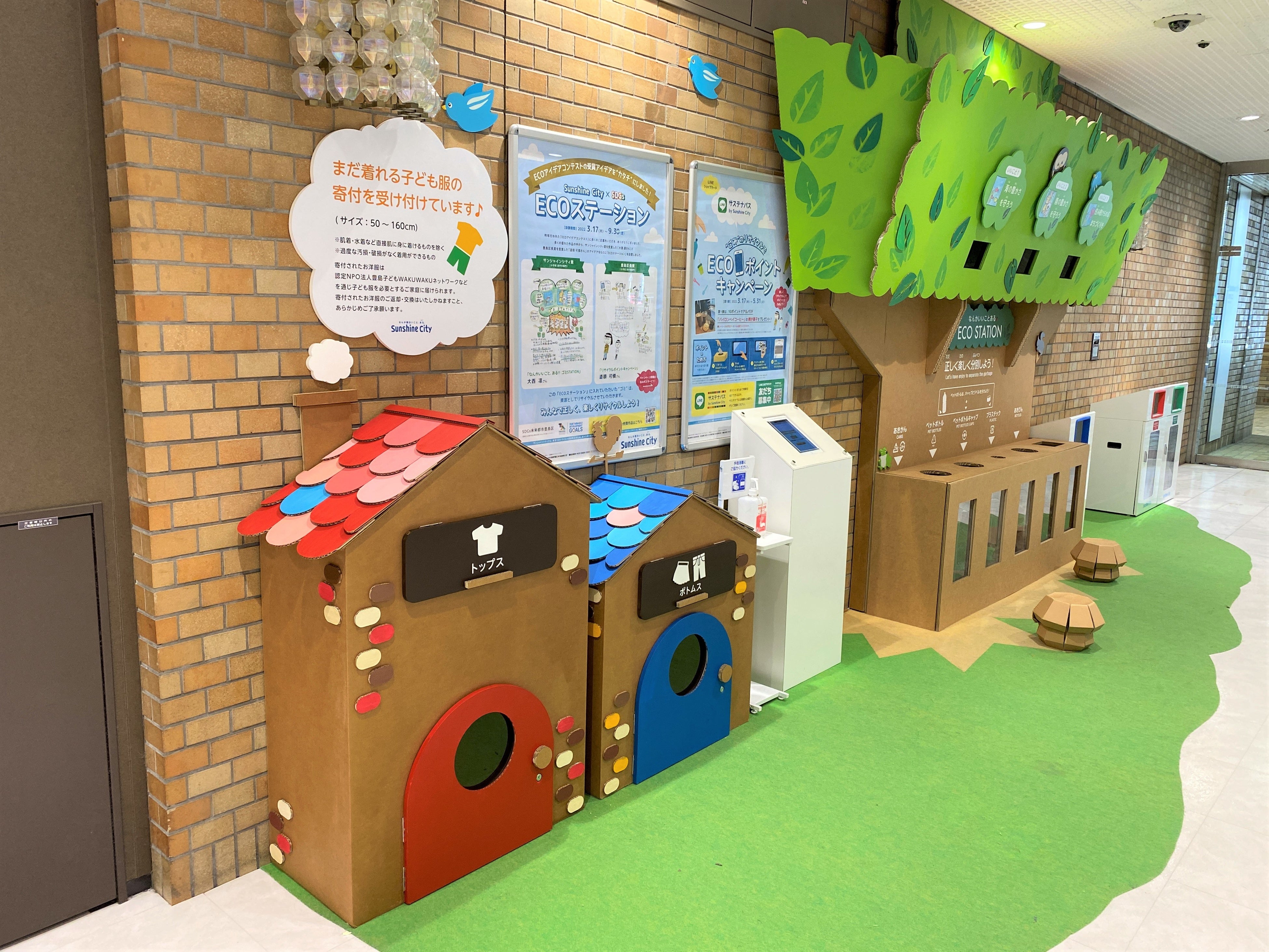サンシャインシティ館内に子ども服回収ボックスを設置し、まだ着られる子ども服を集め、子ども服を必要とするご家庭に届けたり、小物へのリメイクワークショップにて活用したり、その他地域の子どもたちのために活用します。