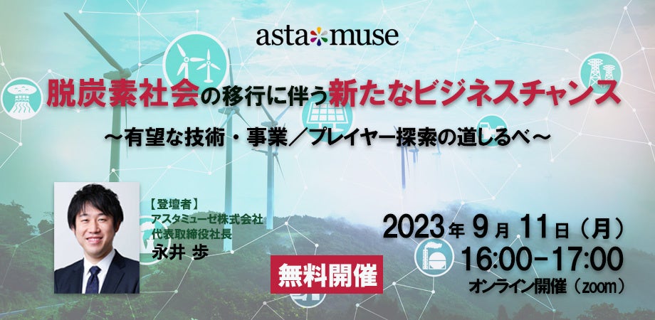 今回のウェビナーでは、世界中のカーボンニュートラルに係る技術/マネタイズ手法/最先端の研究・課題などのデータを収集・分析することで、どのようにして、筋が良い有望な技術・事業やプレイヤーを発掘できるかについてお話ししたいと思います。