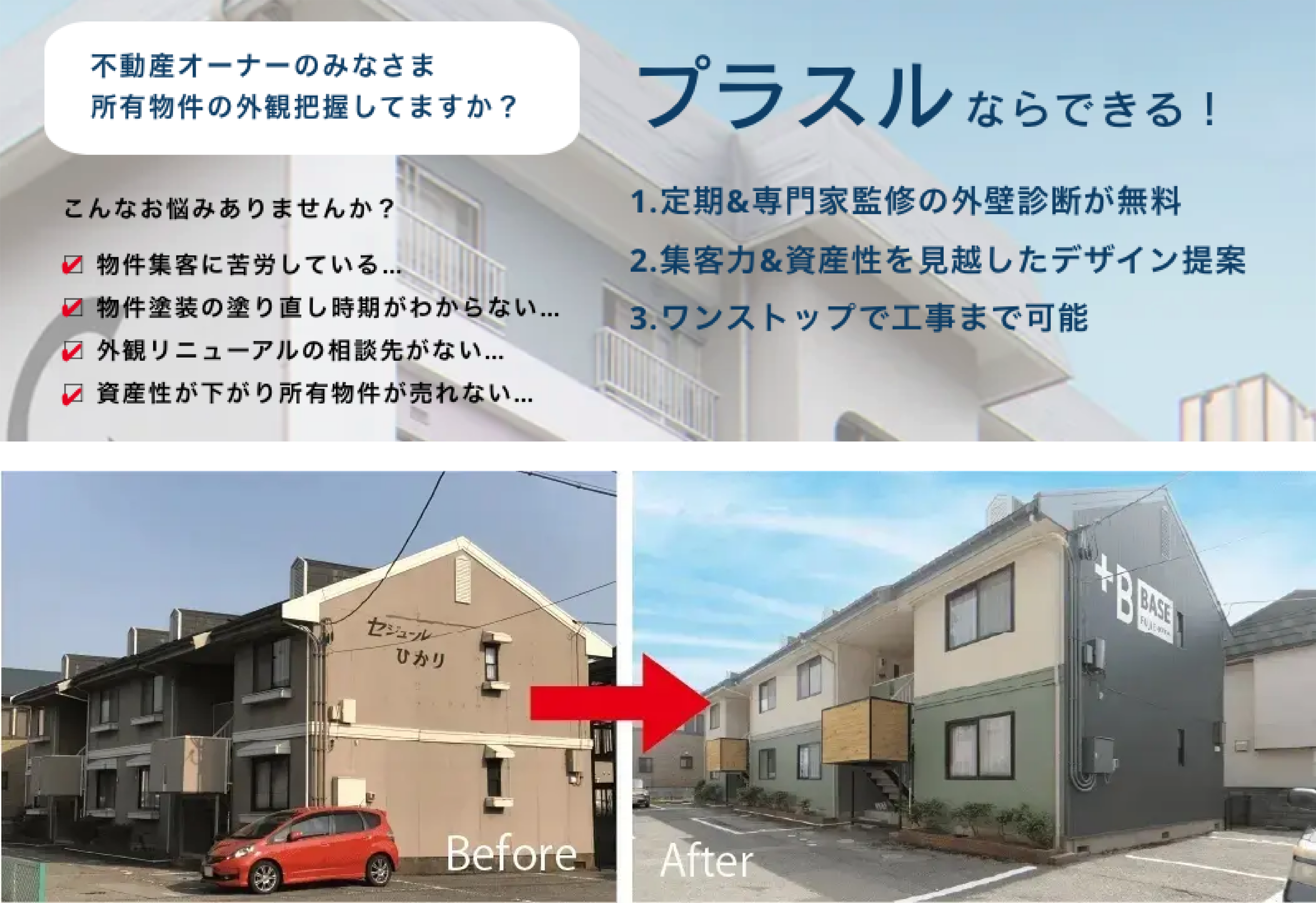 プラスルとは、外壁や外構にデザインを入れることで物件に価値をプラスする、クラスコが提供する賃貸管理会社向けの全国ネットワークです。これまでの外壁提案では、価格以外に競合他社との優位性を図ることができませんでしたが、プラスルならデザインをプラスすることによる物件価値の向上の観点で他社を上回ることができます。プラスルでは、外壁提案のもととなる外壁診断アウトソース化のための専用アプリや、外壁や外構のデザイン提供、賃貸オーナーへの提案ツール、ロゴ開発や3Dパースの提供など外壁工事受注のためのサービスをご用意しております。