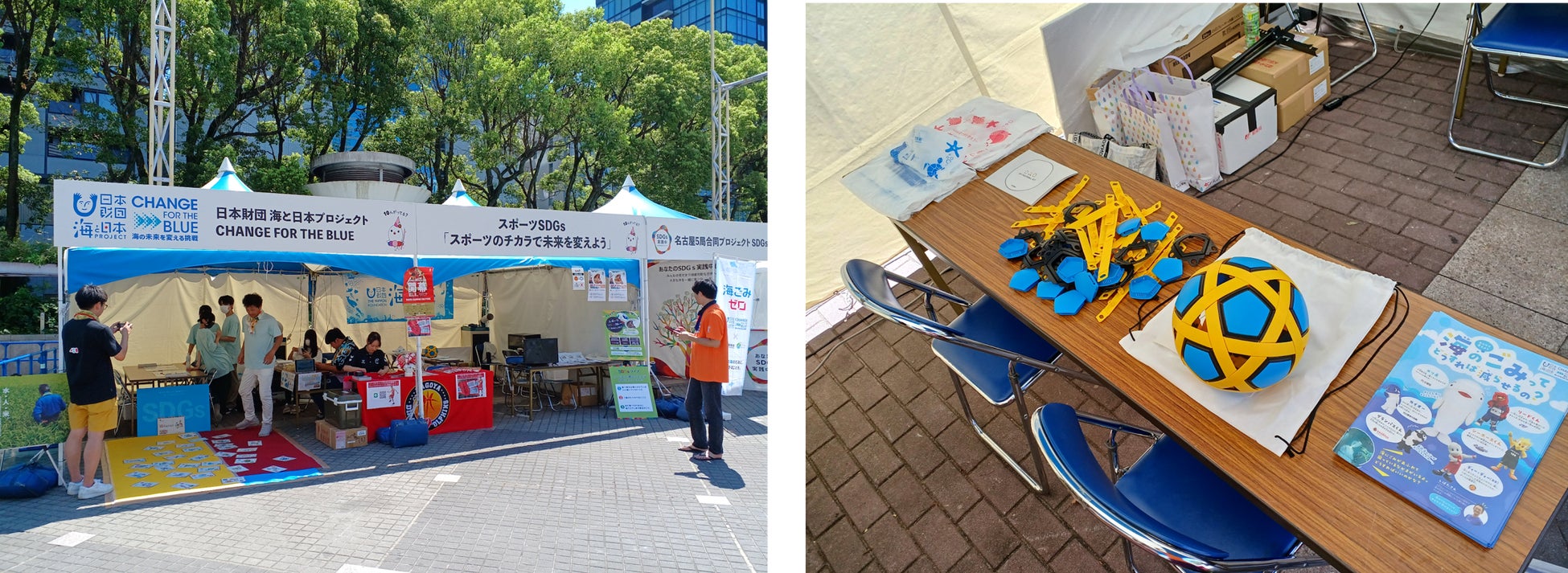 海と日本プロジェクトのブースでは、10チャン縁日に来場された方に対して、一人ひとりが海洋ごみの問題を自分ごと化し、”これ以上、海にごみを出さない”という意識を向上させていくことを目的として、環境に配慮し再生素材を活用した組み立て式サッカーボール「MY FOOTBALL KIT(マイ フットボールキット)」を提供しました。