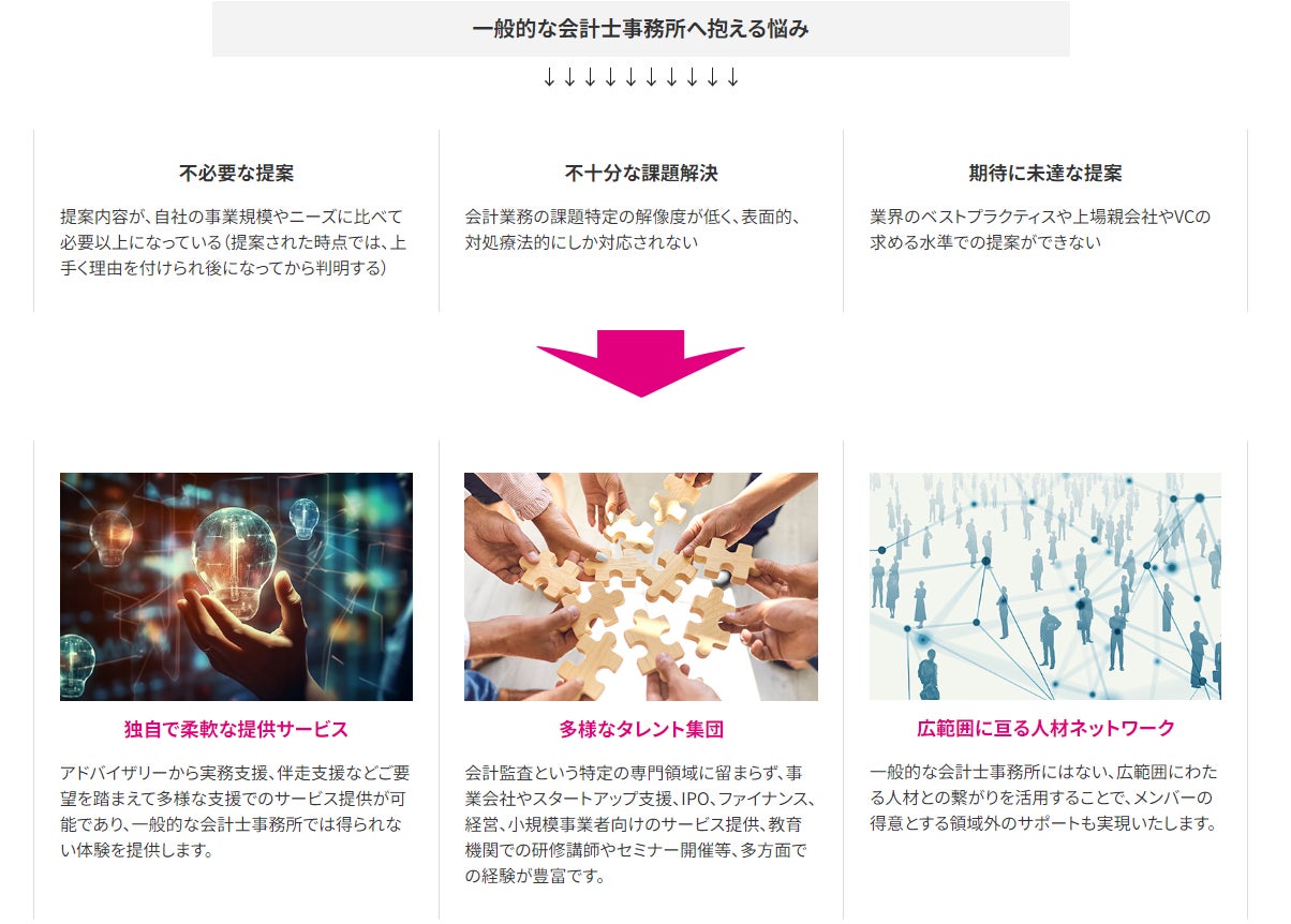 会計監査という特定の専門領域に留まらず、事業会社やスタートアップ支援、IPO、ファイナンス、経営、小規模事業者向けのサービス提供、教育機関での研修講師やセミナー開催等、多方面での経験が豊富なメンバーが揃っています。
