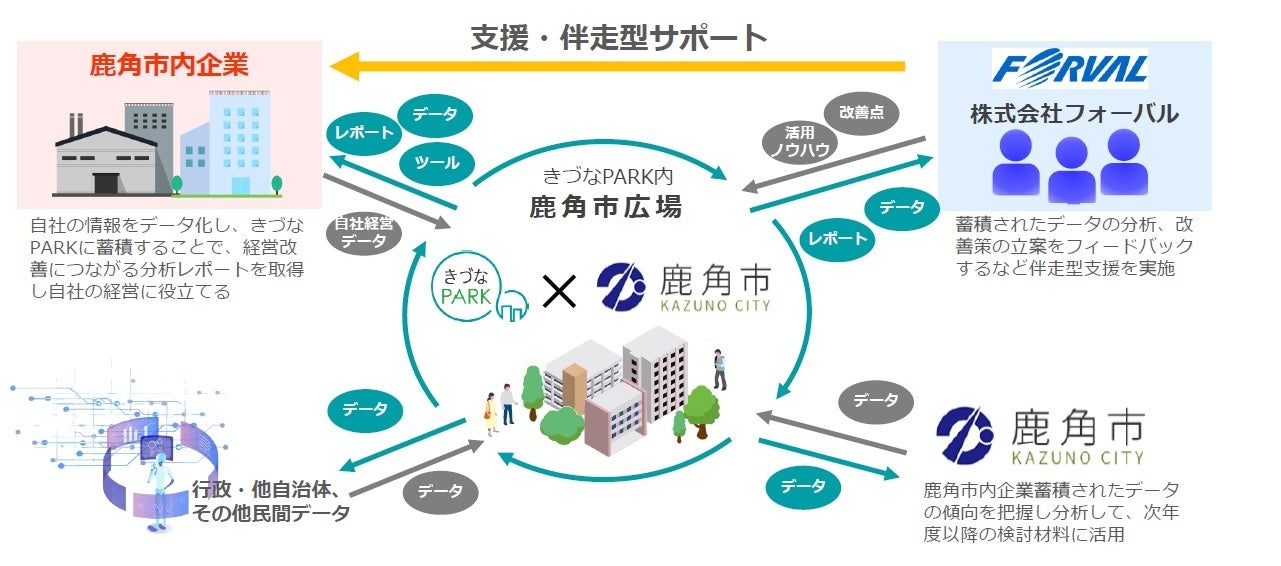 今回、この「きづな PARK 」内に鹿角市内企業専用のデータ蓄積・分析が可能な場をクラウド上で「鹿角市広場」として開設します。開設した鹿角市広場は、本事業で開設するWEBサイト(ランディングサイト)と連動させ、訪れる不特定多数の鹿角市企業がいつでも診断が行える状態を構築します。蓄積したデータは、定期的に分析を行い、鹿角市企業に傾向値等(企業名など特定情報はマスキングを実施)の公開を本事業のWEBサイト内で行います。
