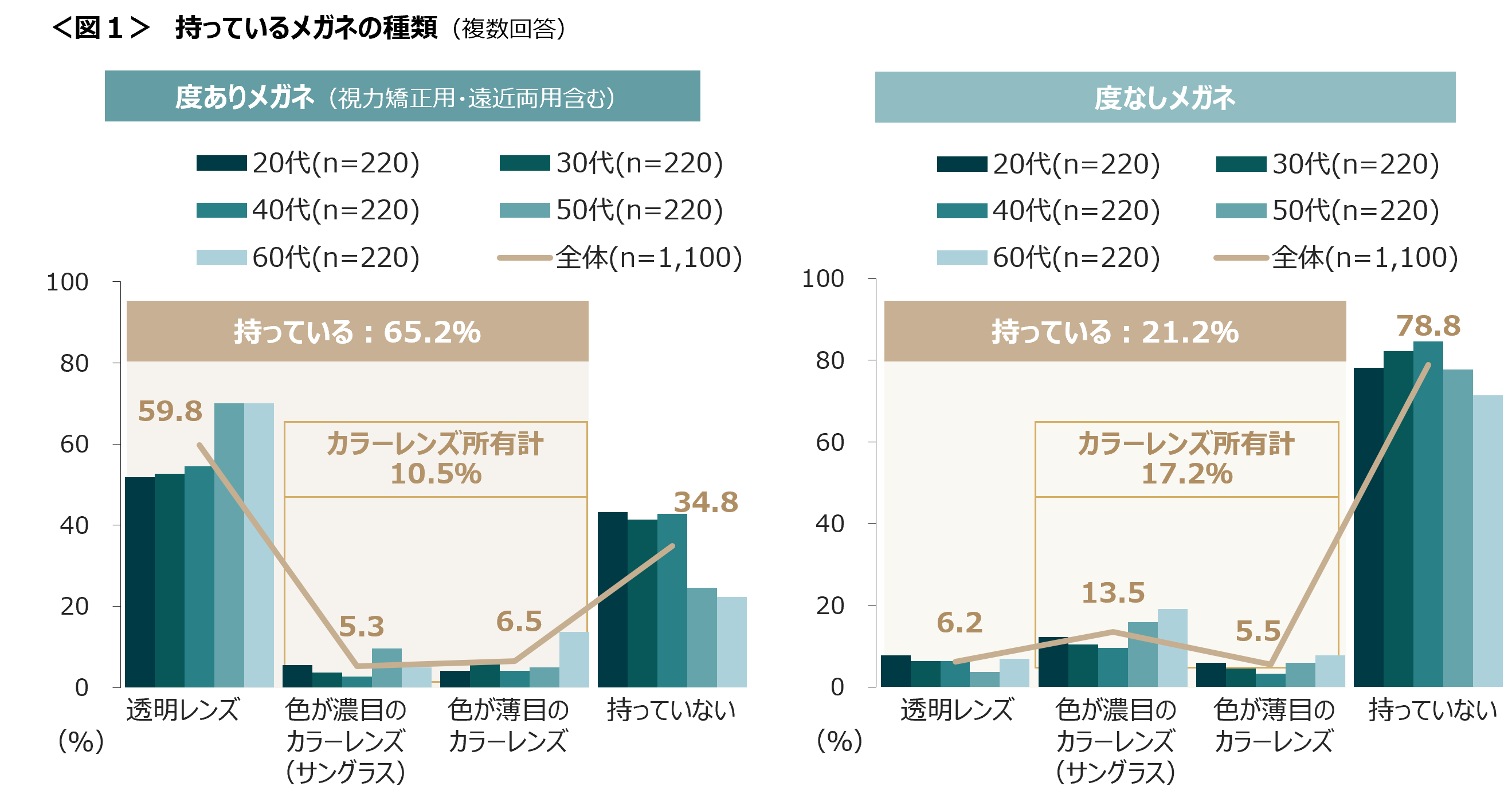 「度あり」メガネの所有率は全体の65.2%。「度なし」メガネの所有率は21.2%。<図1>