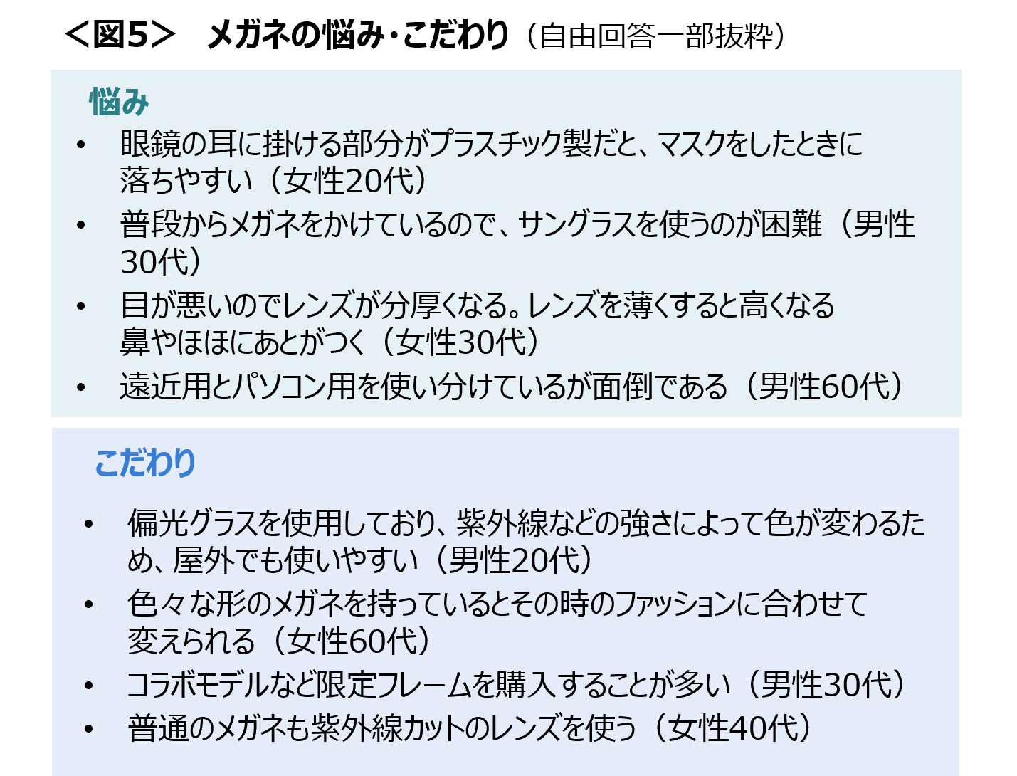 メガネのお悩みとしては、「ずれ落ちる」「レンズが高い」「用途別の使い分けが面倒」などの意見が多く聞かれた。こだわりとしては、「レンズの機能性」や「フレームのデザイン」、「ファッションに合ったもの」といった意見があがった。<図5>