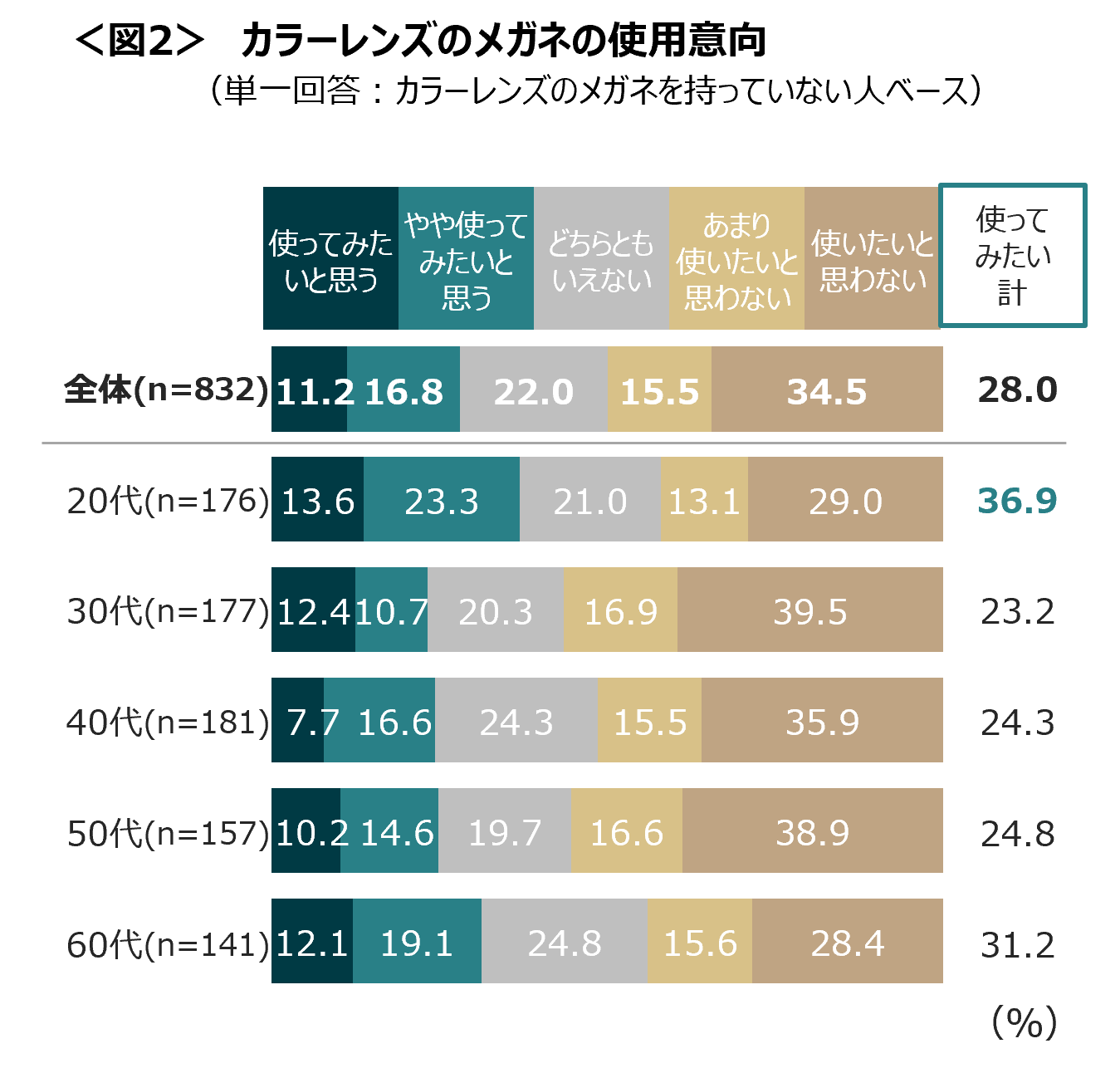 カラーレンズのメガネの使用意向は28.0%。20代は36.9%と意向が高い。<図2>