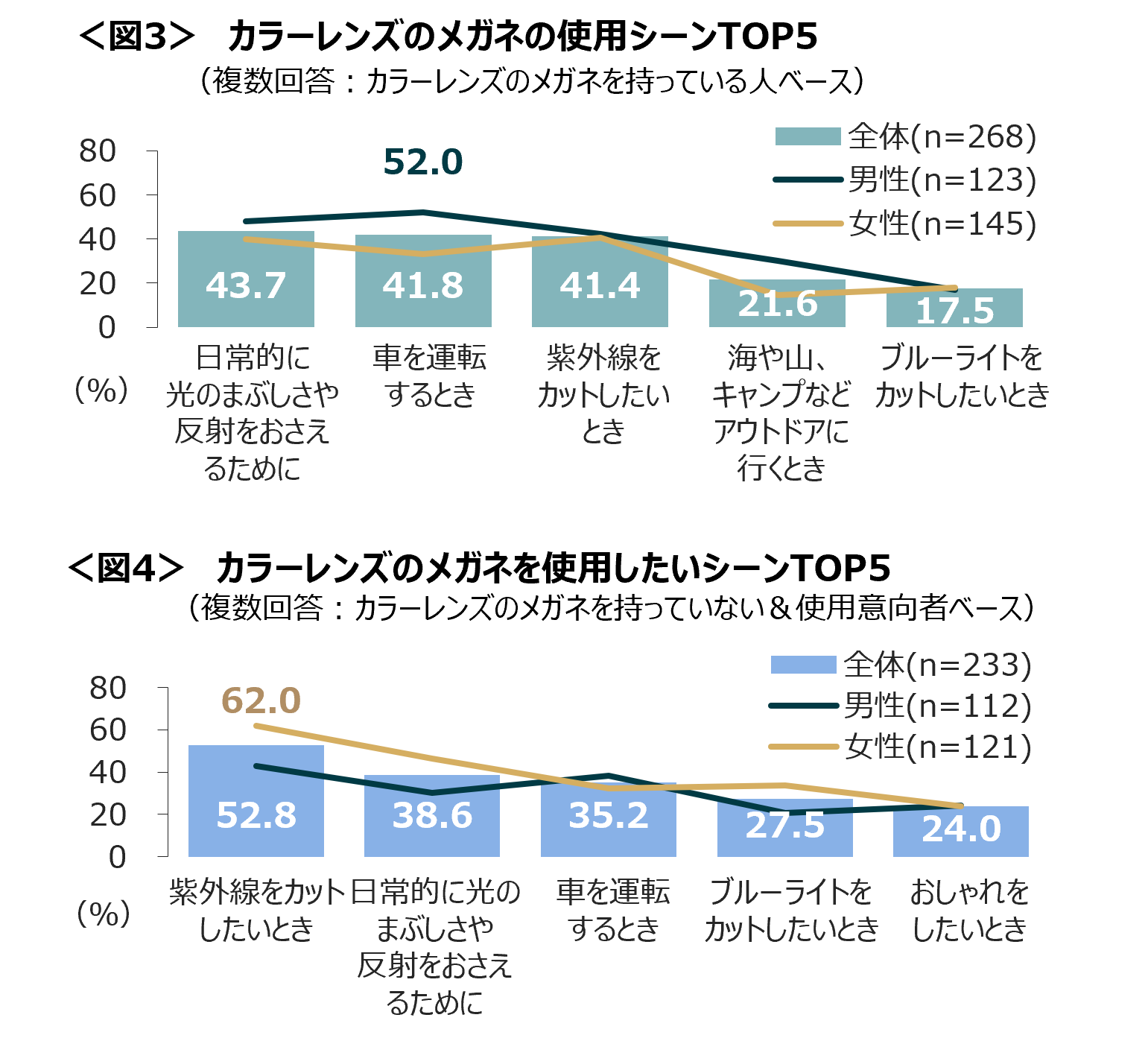 男性は「車を運転するとき」が52.0%で最も高い。使用意向のある人が使ってみたいと思うシーンとしては「紫外線をカットしたいとき」「日常的に光をおさえるため」などの実用的な面に加え、「おしゃれをしたいとき」が24.0%で5位にあがった。使用意向のある女性は「紫外線をカットしたいとき」が62.0%と高い。<図4>