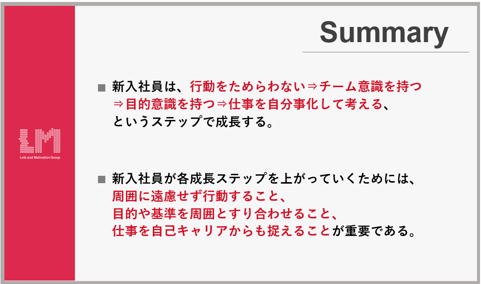 ⇒「目的意識を持った新入社員」⇒「自立的な新入社員」というステップで成長していくことが示唆されました。