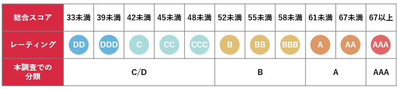 *総合スコア:一定の範囲ごとに分類し、レーティングとして整理しています。