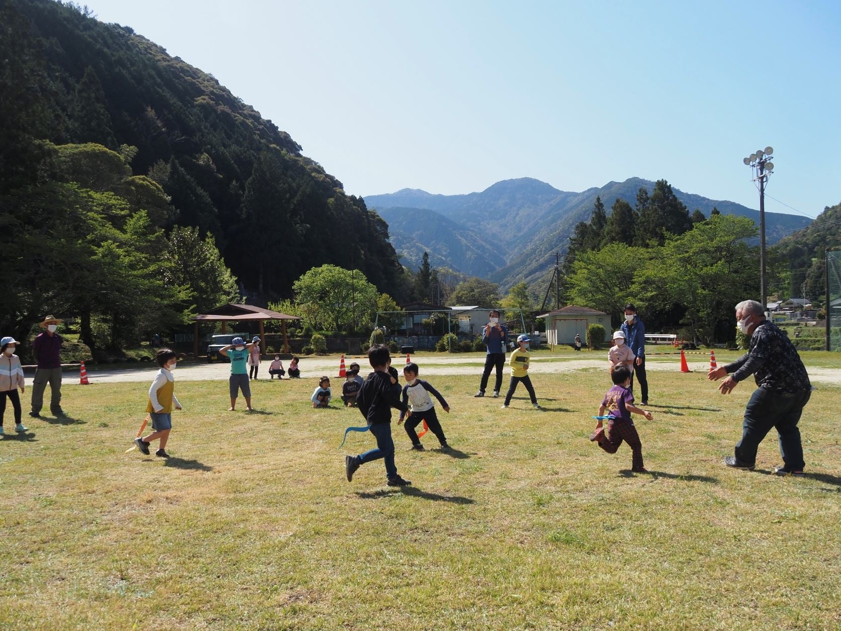 小学校の校庭には、子どもが走り回っている様子がみられたり、松野南小の校歌をみんなで歌ったり、学校のチャ