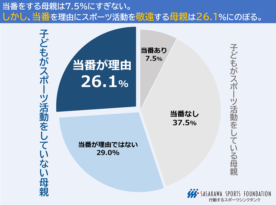 当番をめぐる実態を、「当番をしている母親」「当番はしていないが、スポーツ活動をしている母親」「当番を理由にスポーツ活動をしない母親」「その他の理由でスポーツ活動をしない母親」にわけて、全体の分布を示した。対象となる母親全体を母数にすると、現在当番を担当している母親は7.5%にすぎない。しかし、当番の負担を理由にスポーツ活動を敬遠する母親は26.1%にのぼる。