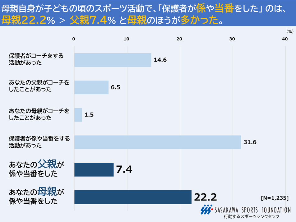 全体では「保護者がコーチをする活動があった」は14.6%、「保護者が係や当番をする活動があった」は31.6%であった。「保護者がコーチをする活動」では、「父親がコーチをしたことがあった」6.5%>「母親がコーチをしたことがあった」1.5%と父親のほうが多く、「保護者が係や当番をする活動」では母親22.2%>父親7.4%と母親のほうが多かった。過去の振り返りとして尋ねているため限界はあるものの、子どもたちの祖父母世代から、指導以外の関与は母親が中心であるという構造には変化がない様子がうかがえる。