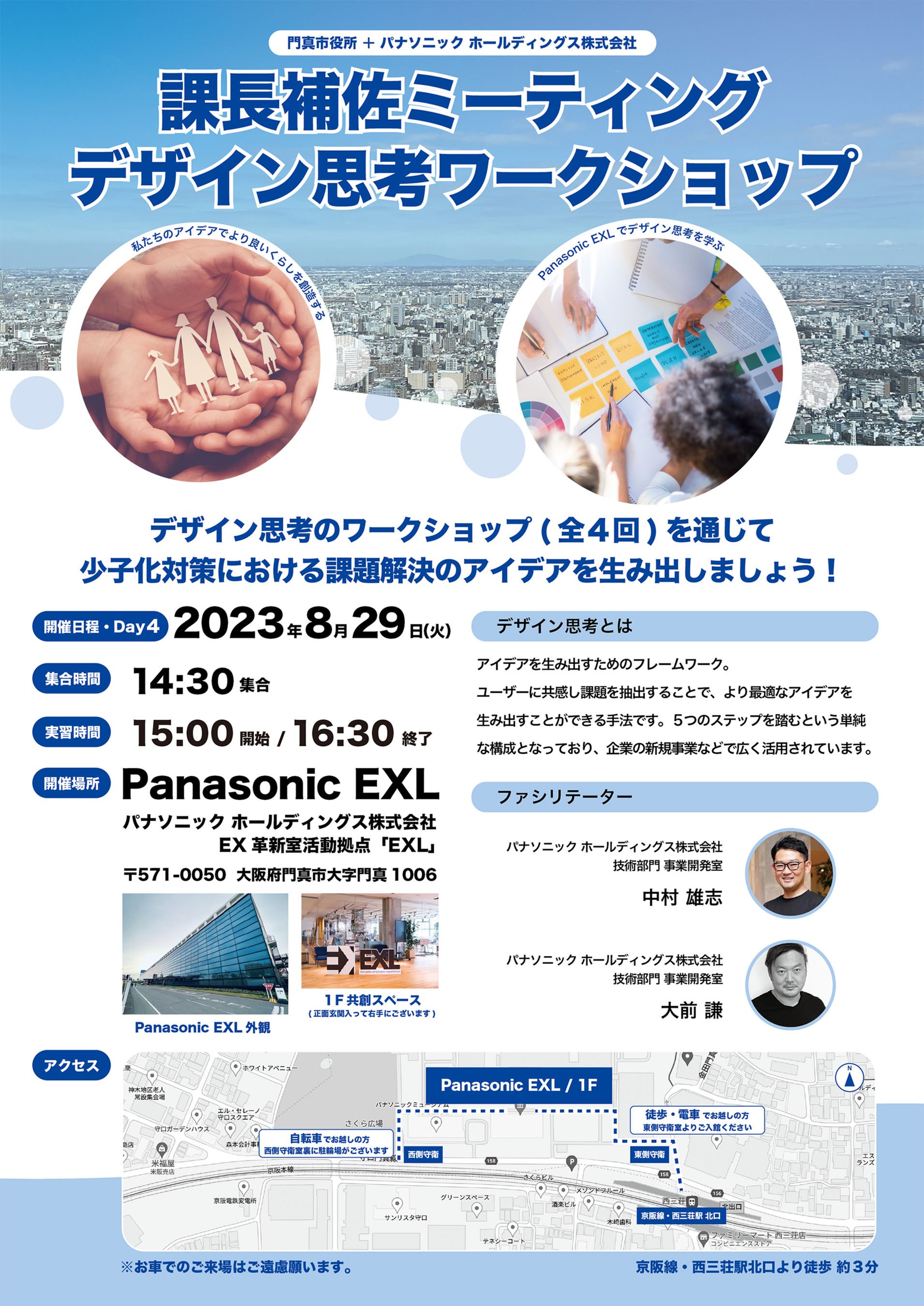 門真市はパナソニック ホールディングス株式会社と連携し、若手課長補佐(17人)を対象に、本年5月から7月までの間、少子化対策を検討するデザイン思考の課題解決ワークショップを実施しました。