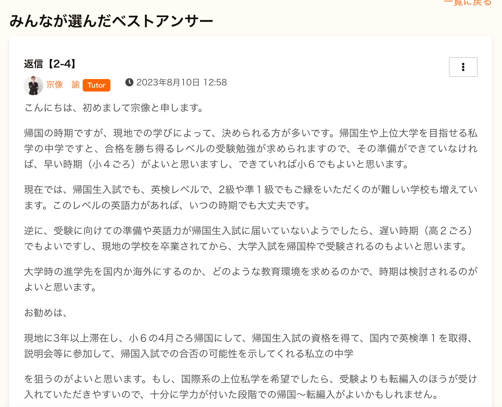 例えば、上記のような専門性の高い質問に対しても、質問された方の背景を把握した上で、チューターが下記のように詳しく返答してくださいます。