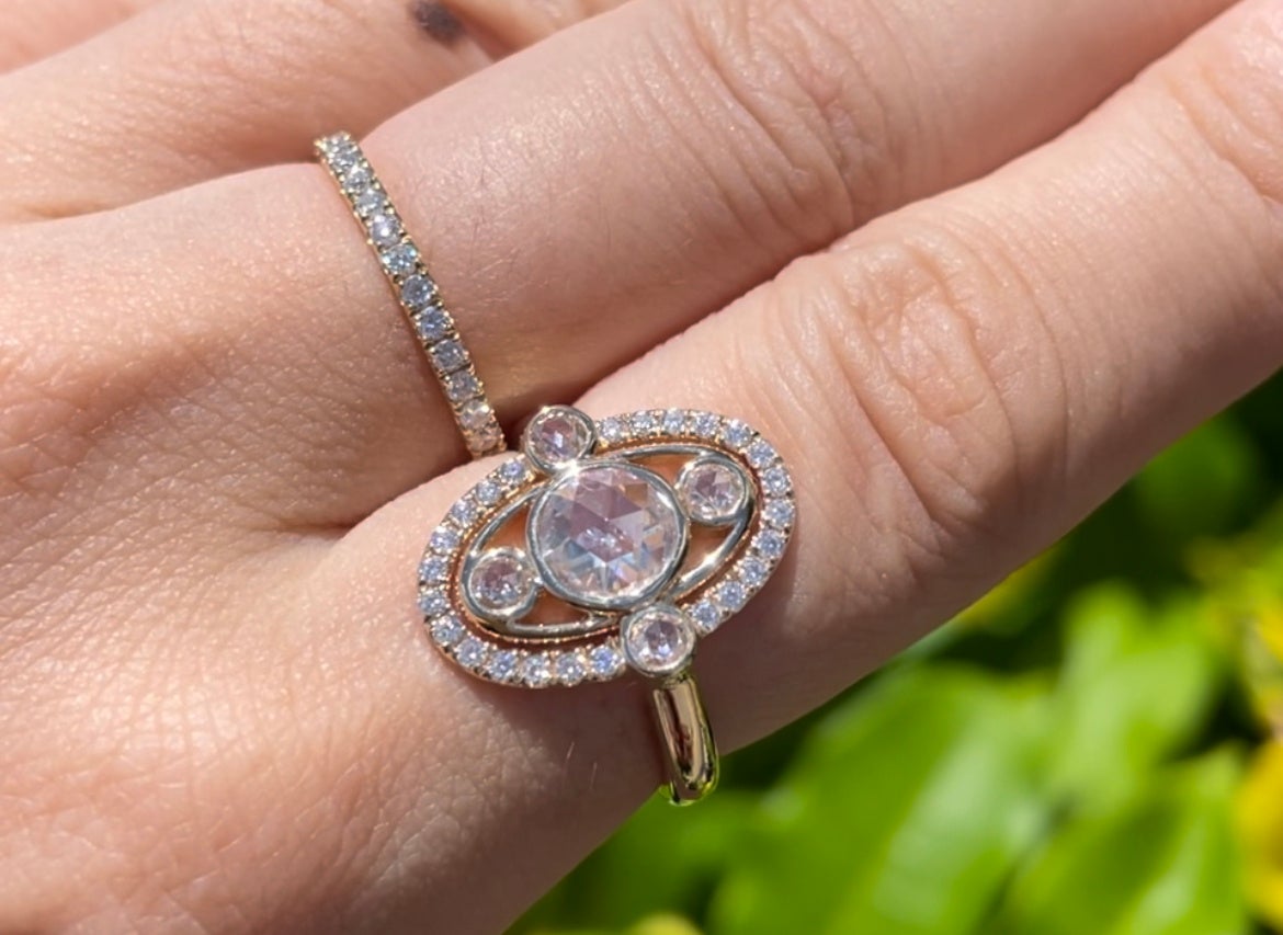 沖縄の海の雫を1滴閉じ込めたような淡いブルーローズカットのモアサナイトをセンターに使用。ブルーローズカットは、今回のために特別に提携工場に依頼して切り出したとても希少なカッティングルースです。
