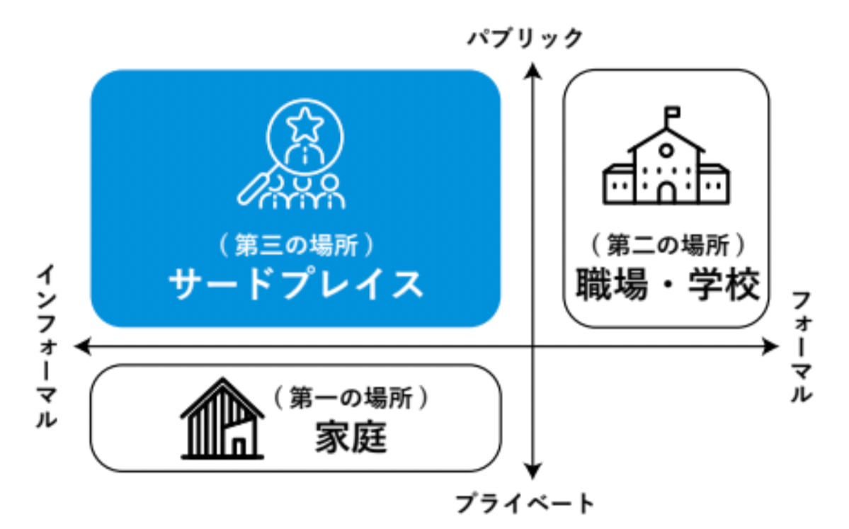 今は「目指す社会に向けて何を実現すべきか」という到達地点を考える時代となっています。サードプレイスとは、学校だけに多くの役割を求めるのではなく、学校の外で一人一人違う目標を持ち、それぞれのペースで主体的に学ぶことで多様な才能を開花させる第三の学びの場です。