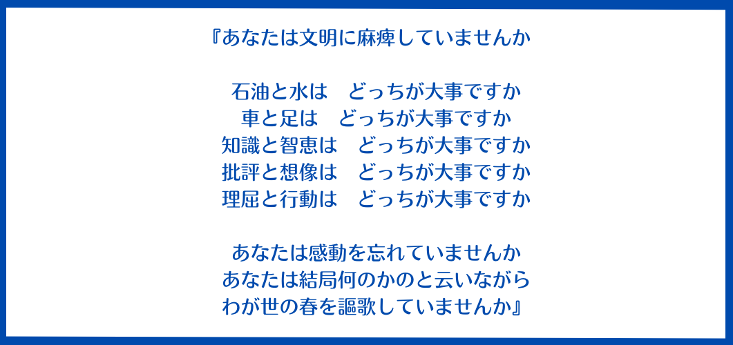 文明が発展し便利な世の中になっていく一方で、その便利さに麻痺し、私たちは本当に大切なものを見失ってしまっているのかもしれません。