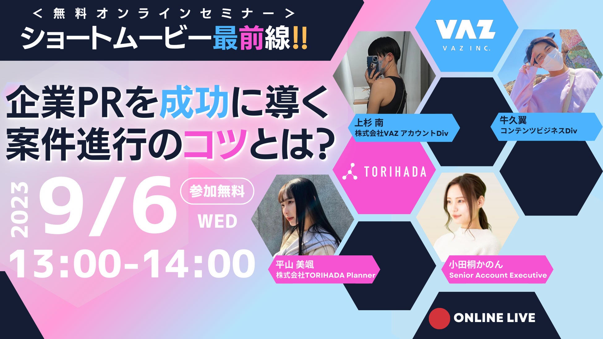 本ウェビナーでは、国内最大手のYouTuberプロダクションであるVAZの営業担当と、演技力を活かしたあるある動画や表現力抜群のエンタメ動画で人気のYouTuber「おさき」のマネージャー、ショートムービーマーケティング事業に強みを持つTORIHADAの営業担当とプランナーにて、最新の動画マーケティングのトレンドやTipsをご紹介します。また、営業・インフルエンサーのマネージャー両者の視点から、企業案件を成功に導くコツを対談形式でお届けします。