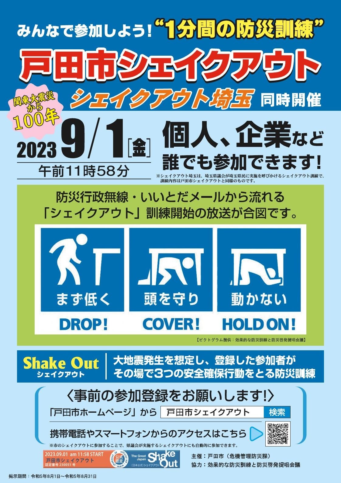 埼玉県戸田市では、令和5年9月1日(金)午前11時58分(関東大震災の発生時刻に、防災行政無線から流れる放送を合図(約1分間)に、一人ひとりがそれぞれいる場所で、「1:DROP!(まず低く)、2:COVER!(頭を守り)、3:HOLD ON!(動かない)」などの安全確保行動を行う、シェイクアウト訓練を実施します。