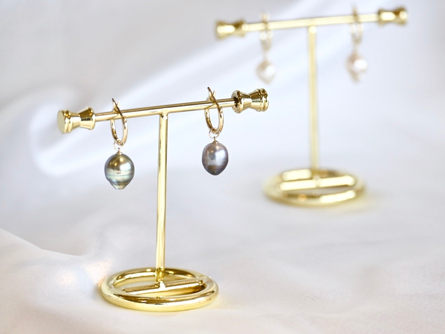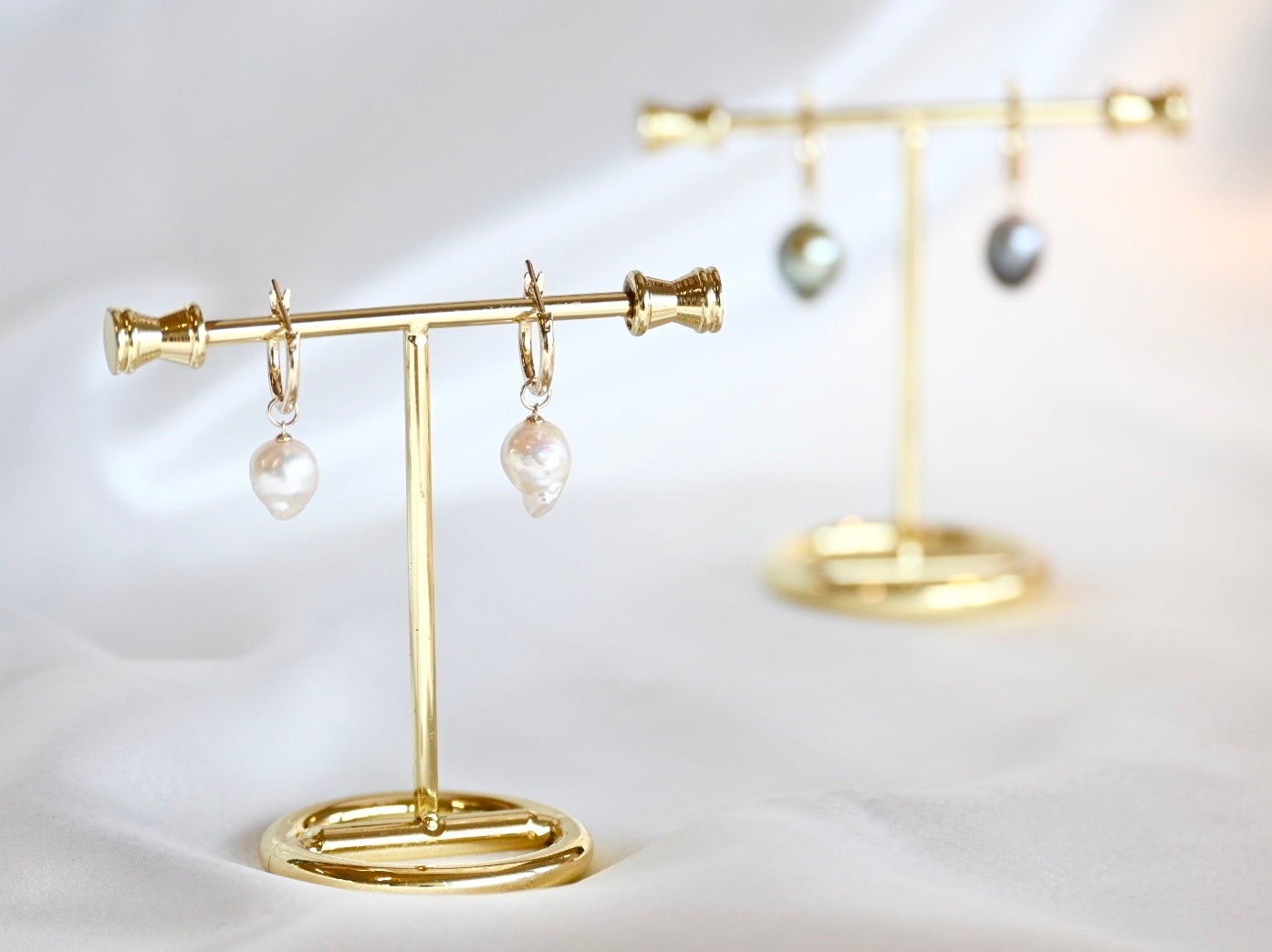 お手持ちのピアスやネックレスに付けて楽しめる天然石やパールを使ったチャームに小ぶりで上品なアコヤバロックパールが登場しました。カラーは、純白な輝きを持ち、爽快で涼しげな雰囲気を与える「ホワイト」、神秘的なカラーがモードな印象を引き立てる「ブラック」の2種類をご用意しております。