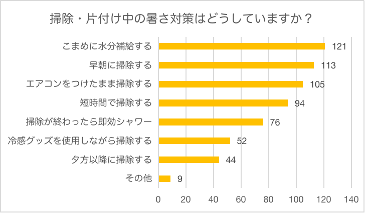 「掃除・片付け中の暑さ対策はどうしていますか?」という質問では、「こまめな水分補給」が最も多く、次に、「早朝に掃除する」「エアコンをつけたまま掃除する」などの暑さ対策が挙げられていました。