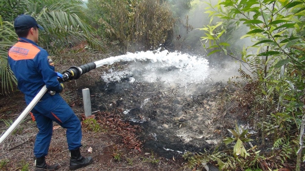 環境にやさしい特長をもつ石けん系消火剤は、一般建物火災だけでなく、森林火災・泥炭火災用消火剤としても開発し、森林火災や泥炭火災が多いインドネシア等で普及活動に取り組んでおり、「第7回グッドライフアワード 環境大臣賞」も受賞しています。