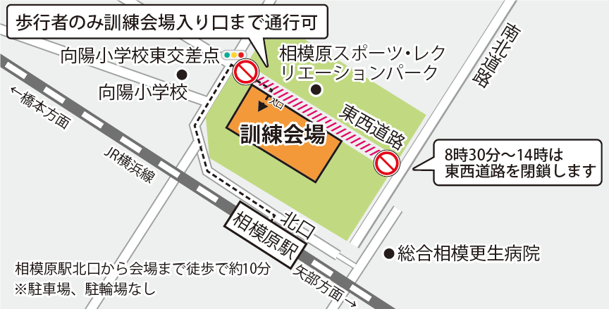 ※訓練実施に伴い、午前8時30分から午後2時まで東西道路は全面通行止めとなります。