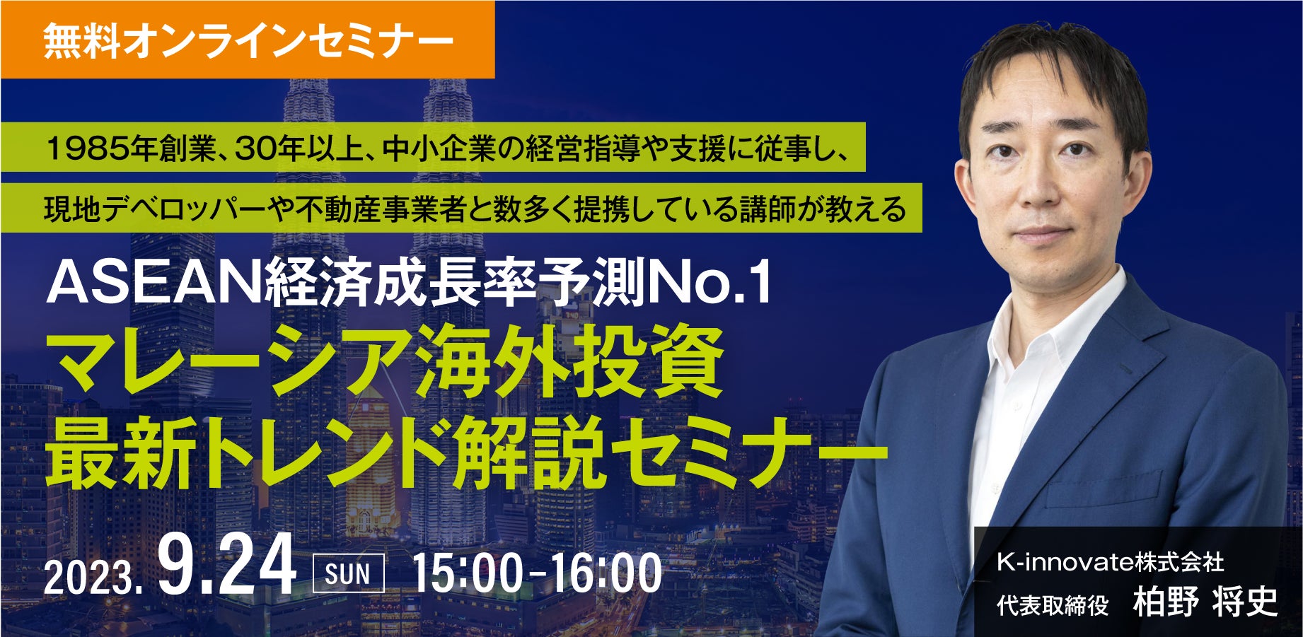 そこで今回、1985年創業、30年以上、中小企業の経営指導や支援に従事し、現地デベロッパーや不動産 事業者と数多く提携しているK-innovate株式会社 代表取締役 柏野将史様を講師にお迎えし、マレーシアの不動産投資の最新情報をお伝えいたします。