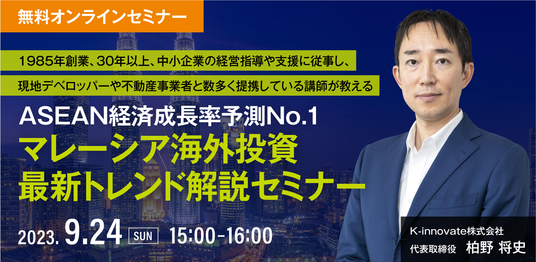 そこで今回、1985年創業、30年以上、中小企業の経営指導や支援に従事し、現地デベロッパーや不動産 事業者と数多く提携しているK-innovate株式会社 代表取締役 柏野将史様を講師にお迎えし、マレーシアの不動産投資の最新情報をお伝えいたします。