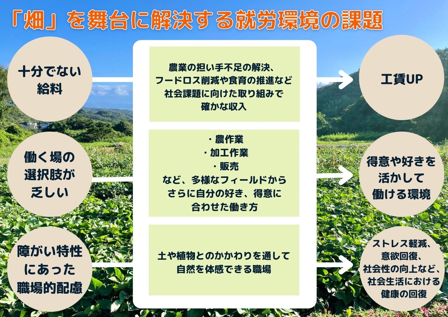 農林水産省が推進する「農福連携」すなわち、障がい者等が、担い手不足などの課題を抱えた農業分野で活躍することを通して、社会参画していくことに取り組んでいます。農業をきっかけとした様々な選択肢のなかで、自分たちの得意や好きを活かせる居場所をつくります。