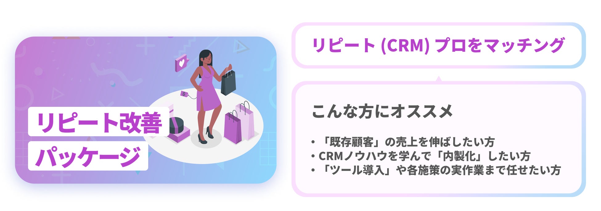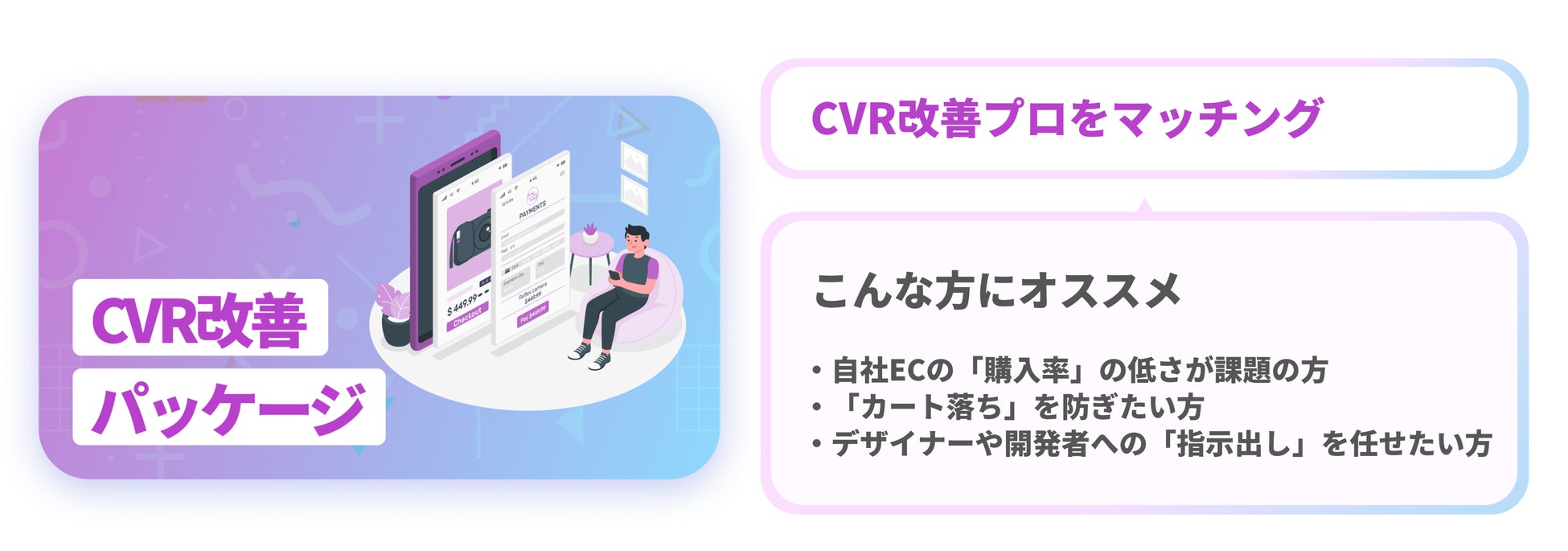 本サービスは、自社EC事業をされている事業主さまをターゲットに、「診断パッケージ」「集客パッケージ」「CVR改善パッケージ」「リピート改善パッケージ」の4つのパッケージから、必要な要素だけをカンタンに選べるようになっています。各パッケージ毎に「ECのプロ」に登録する1,000人以上の複業人材を適切にマッチングし、事業を支援いたします。