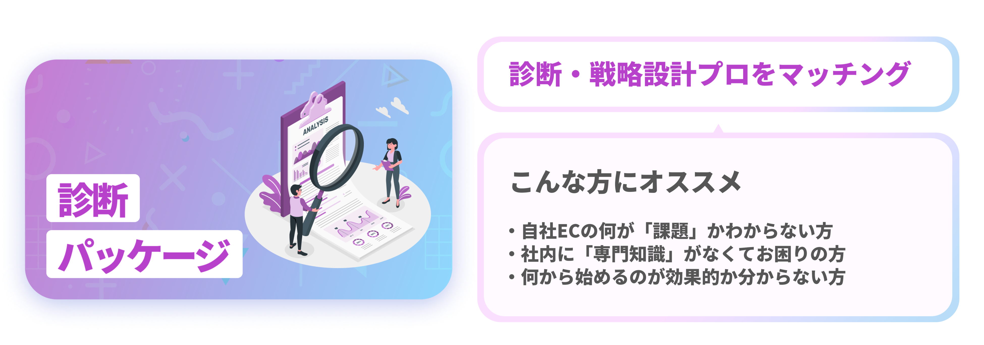 本サービスは、自社EC事業をされている事業主さまをターゲットに、「診断パッケージ」「集客パッケージ」「CVR改善パッケージ」「リピート改善パッケージ」の4つのパッケージから、必要な要素だけをカンタンに選べるようになっています。各パッケージ毎に「ECのプロ」に登録する1,000人以上の複業人材を適切にマッチングし、事業を支援いたします。