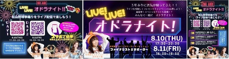 ライブ配信事業を手掛ける株式会社クリエ(代表:出口 友子、本社:愛媛県松山市)は松山商工会議所(会頭:髙橋 祐二)主催のもと、2023年8月10日(木)11日(金)の二日間、松山野球拳おどり(運営:松山野球拳おどり実行委員会)の様子をライブコマースで配信する「LIVE!LIVE!オドラナイト!」を開催しました。