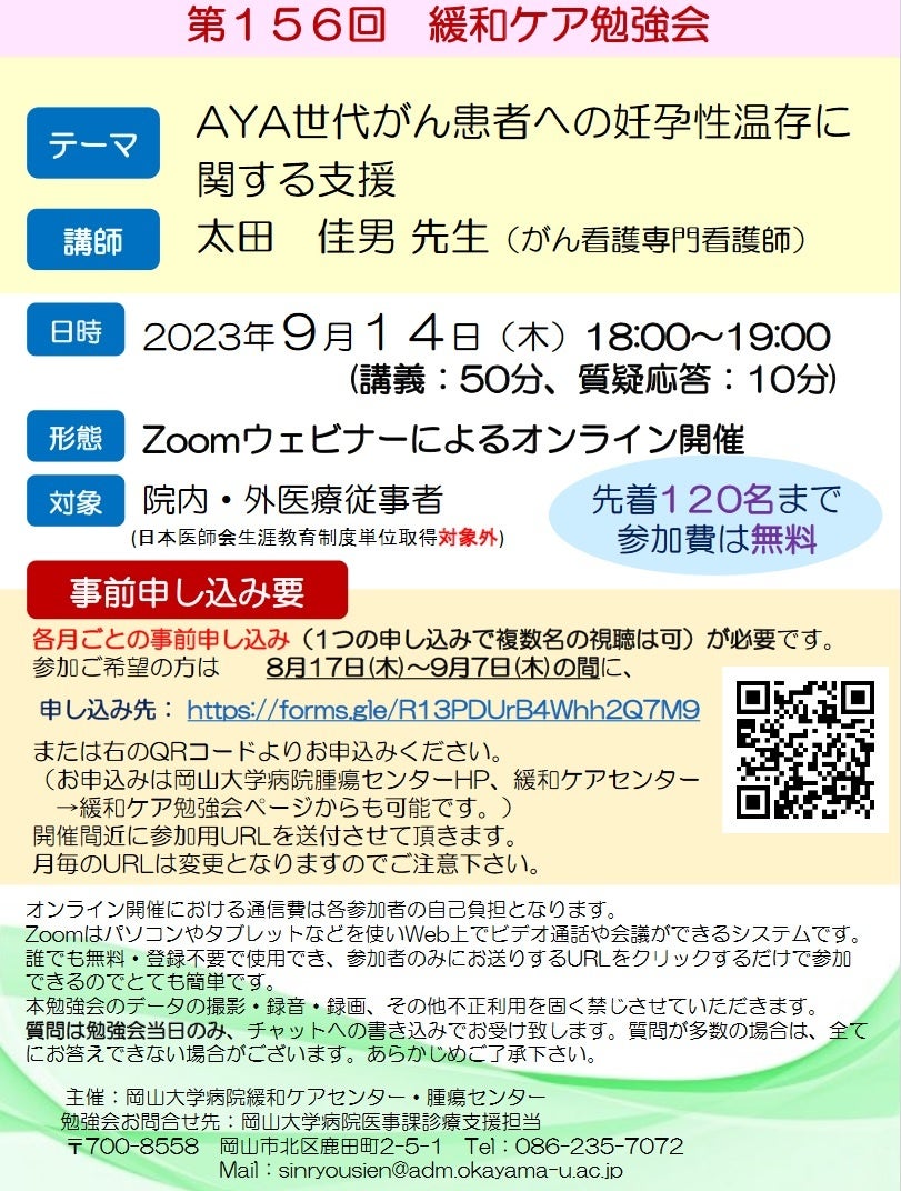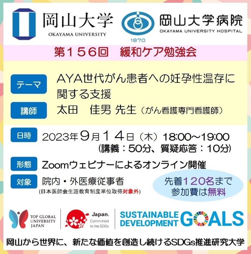 第156回緩和ケア勉強会を2023年9月14日(木)18:00~19:00に「AYA世代がん患者への妊孕性温存に関する支援」と題して、オンラインで開催します。