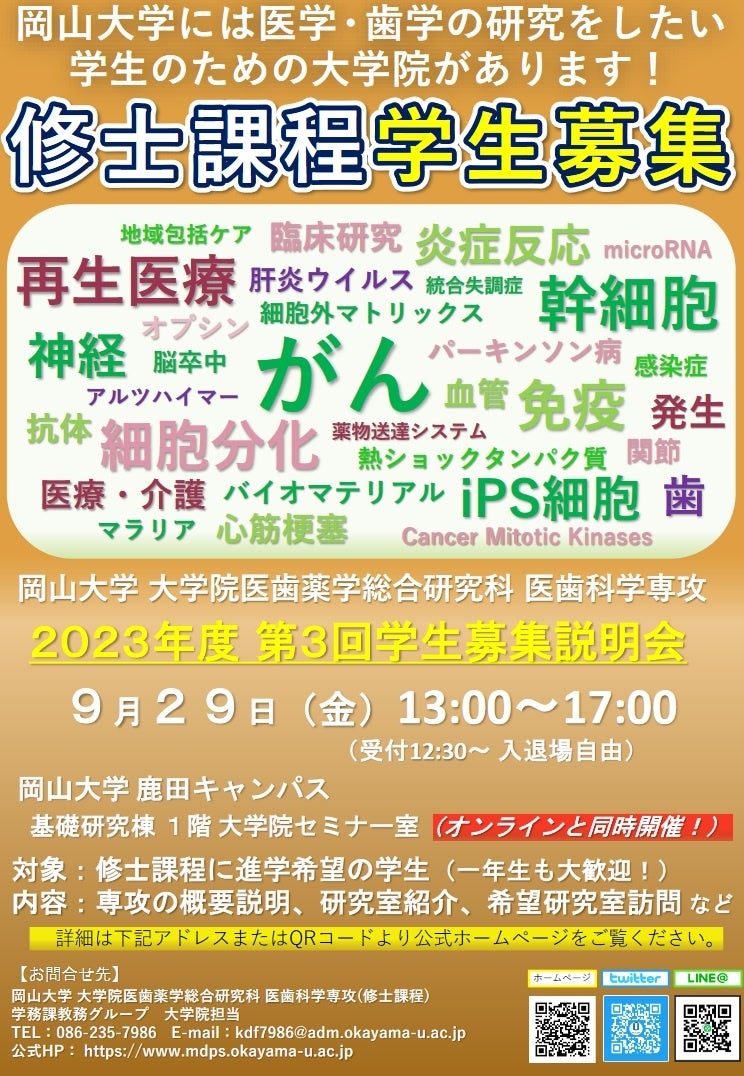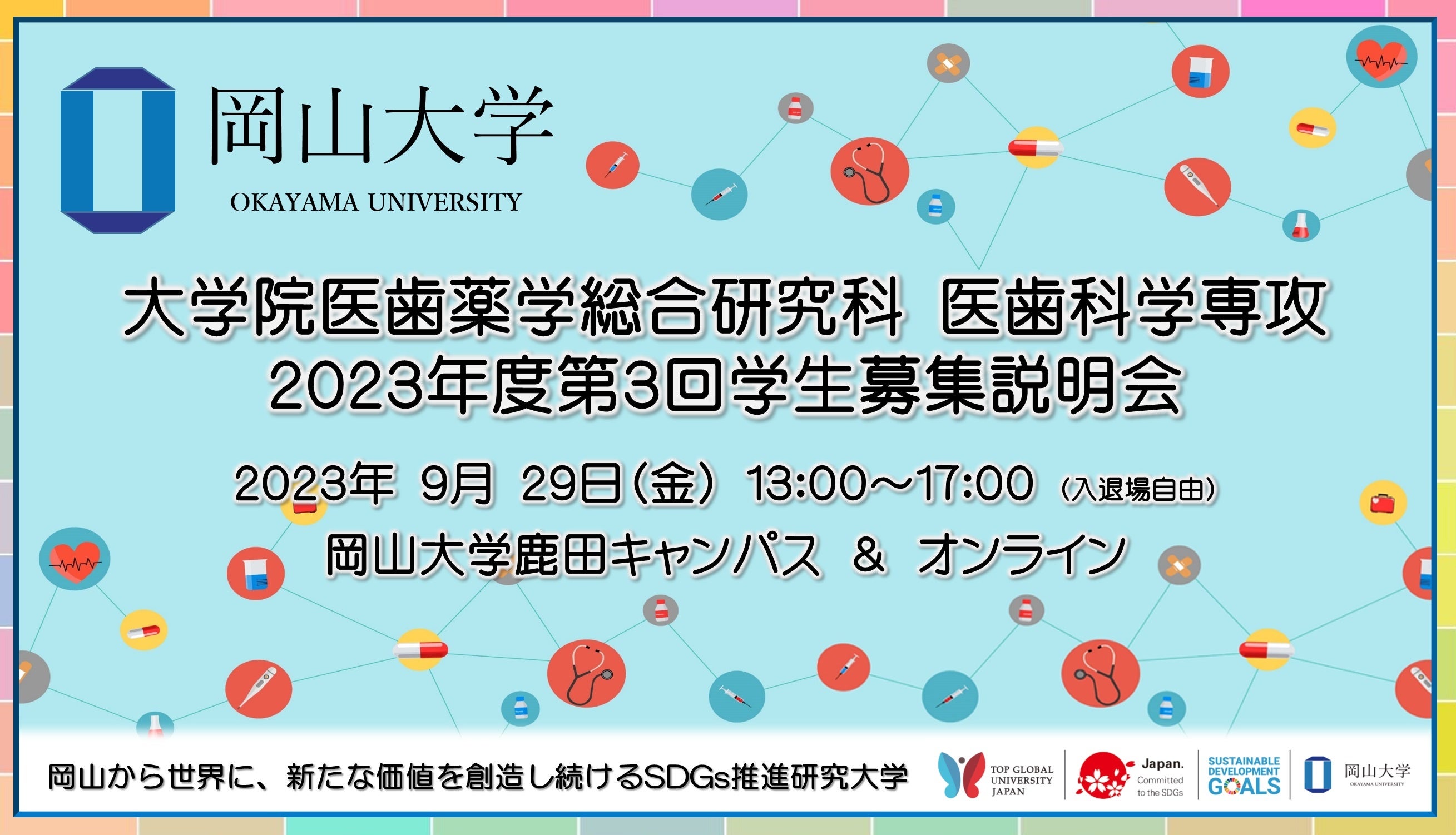 国立大学法人岡山大学(本部:岡山市北区、学長:那須保友)大学院医歯薬学総合研究科・医歯科学専攻(修士課程)では、2023年9月29日(金)13:00から「2023年度第3回学生募集説明会」を本学鹿田キャンパス(岡山市北区)での現地開催とオンライン開催の同時にて実施します。