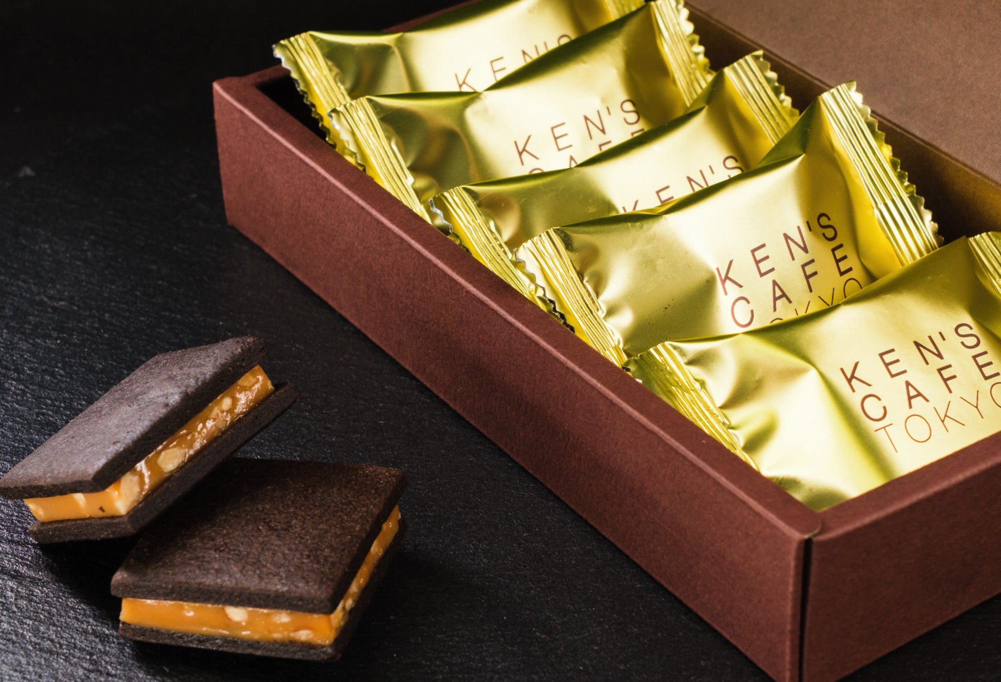 生キャラメルのようなくちどけなめらかなキャラメルを香ばしいカカオクッキーでサンドしました。キャラメルには食感のアクセントとしてくるみを入れており、カカオクッキーとキャラメルの間には高級チョコレート「DOMORI SpecialT」を入れているのでチョコレートの風味も感じていただけます。