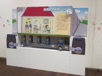 ●内容:下水道の仕組み・役割、浸水対策、市の下水道の歴史等の紹介パネル、家庭内排水設備模型(写真右)、下水道クイズ、デザインマンホール(実物)および令和3年度に実施の「マンホールふたデザインコンクール」優秀作品パネルほか