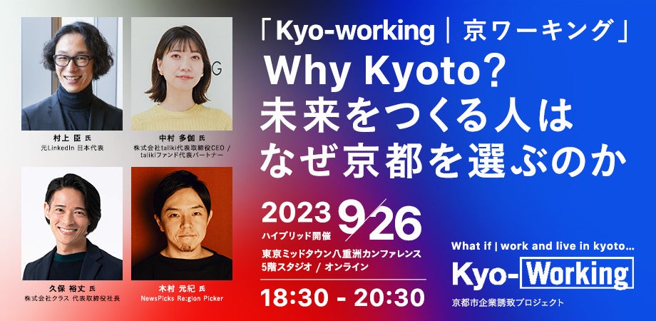 この度、Kyo-workingの一層の認知度向上を図るため、連続イベントの第1弾として、実践者によるトークイベント「Why Kyoto?未来をつくる人はなぜ京都を選ぶのか」を東京都内で開催しますので、下記のとおり、お知らせします。
