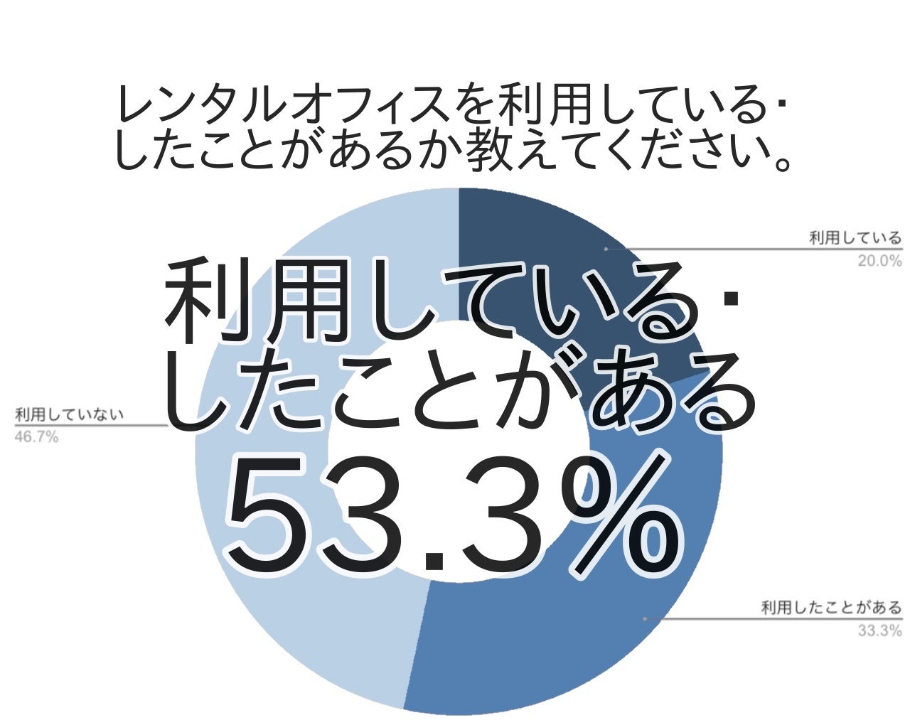 今回のアンケートの結果では吹田市・高槻市・守口市におけるレンタルオフィス利用率は53.3%(利用している20.0%・利用したことがある33.3%の合計)で、半数強の方がレンタルオフィスを利用した経験があることが分かりました。