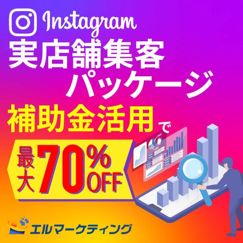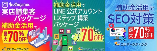 Webマーケティングの支援サービスを行う株式会社エルマーケティングは、補助金を活用して購入価格が最大70%オフとなる、IT集客のパッケージ商品を「JSaaSストア」にて新たに販売開始いたします。中小企業や個人事業主が集客の際に高頻度で検討する、インスタグラム×MEO対策、公式LINE×Lステップ、SEO対策などの商品を取り揃えました。